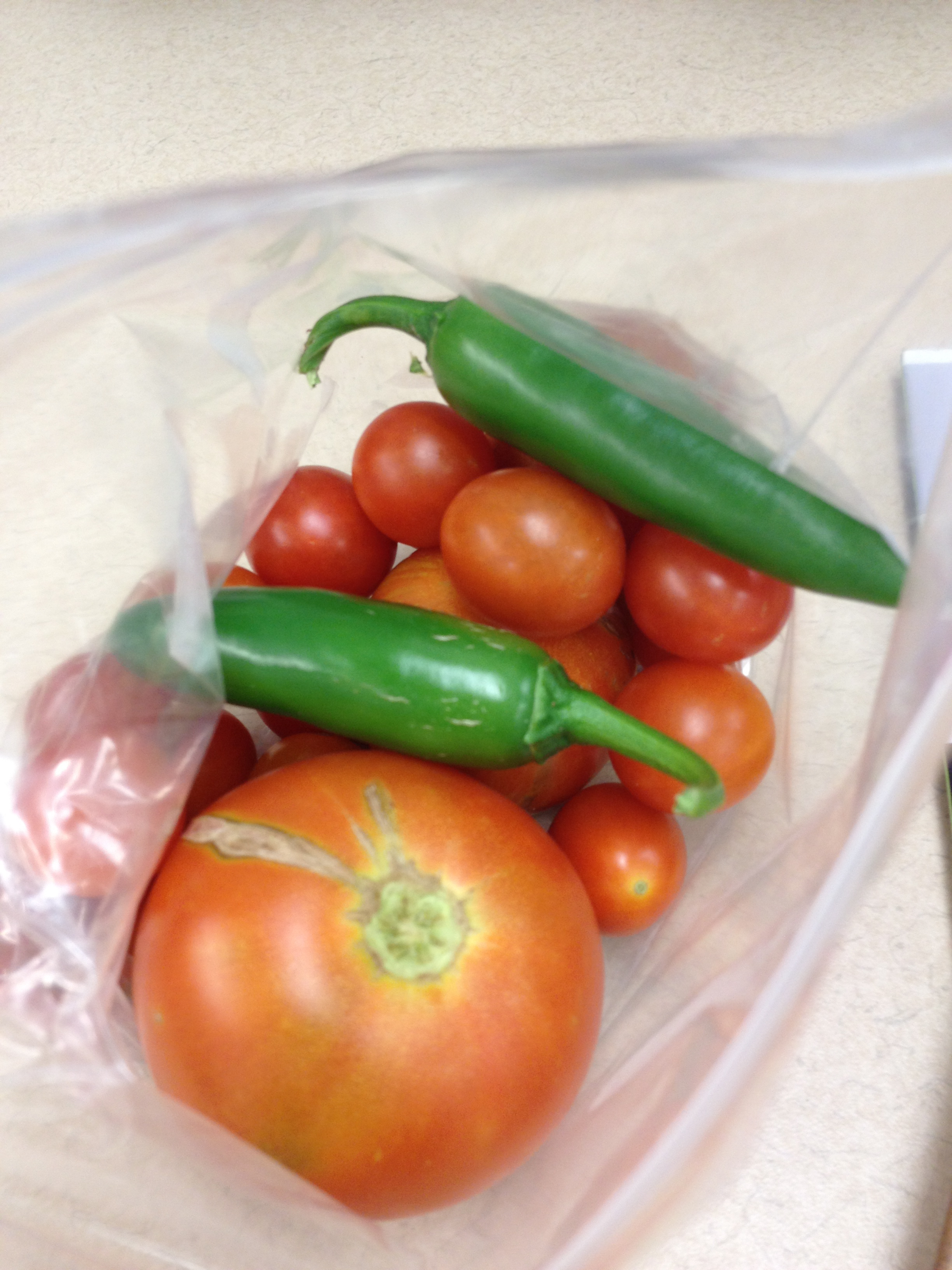 My patience isn’t helped by my co-worker Dave. His tomatoes are booming. He plants more than a dozen varieties in pots lined up on his deck. He, unlike me, knows them by name. He fertilizes them. He speaks to them encouragingly. He lovingly adjusts their vines. And he is rewarded with beautiful, ripe, juicy fruit. He is generous with his harvest, even early in the season, packing up baggies of tomatoes (and even throwing in a pepper or two) to hold me over until I finally see some some red, orange or yellow explode out of the solid green of my garden.