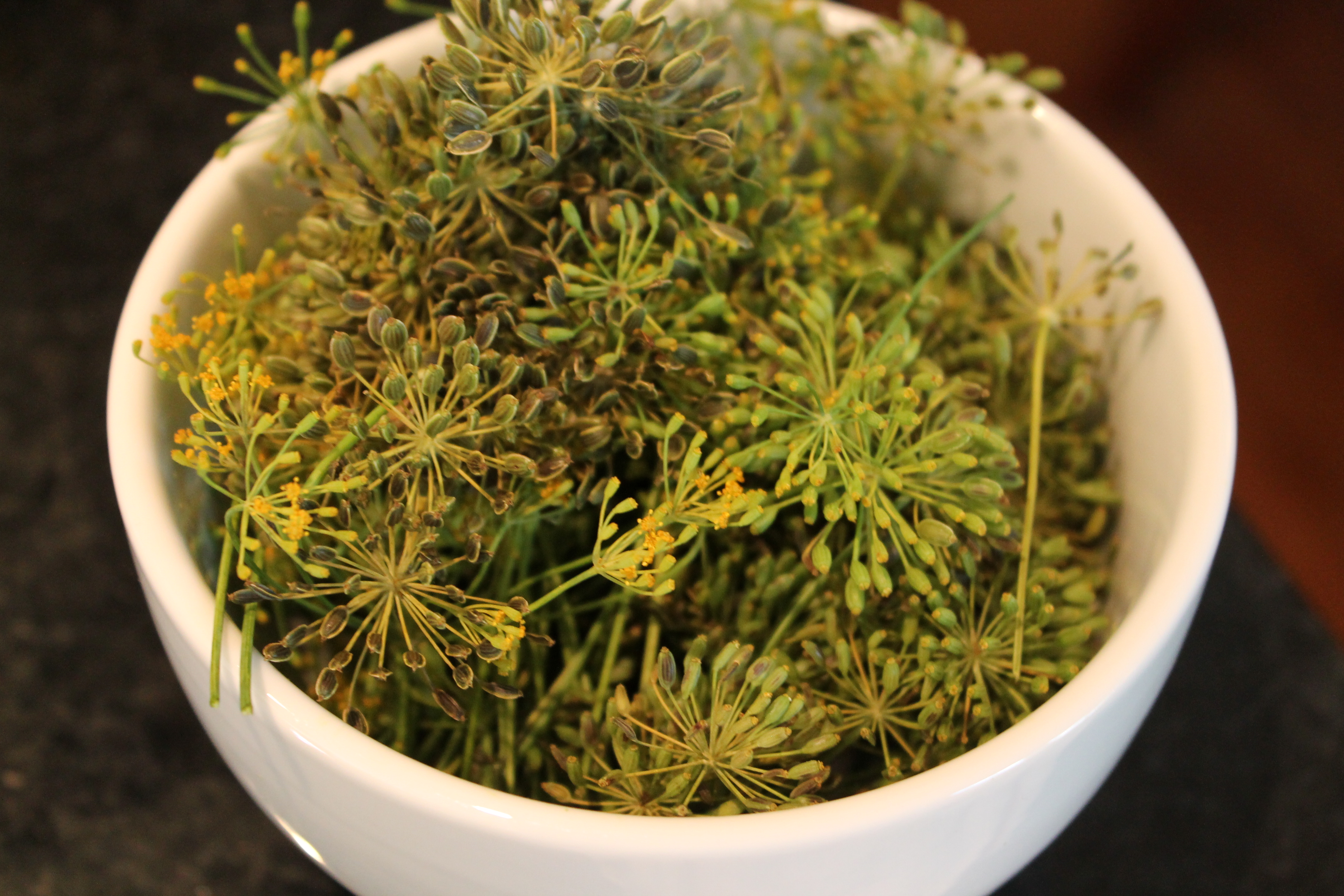 I’m harvesting a couple of cucumbers a day from the garden, but in order to make a big batch of pickles, we decided to buy a bushel from the farmer’s market. We also picked up fresh dill, along with spices like peppercorns, red pepper flakes and mustard seed.