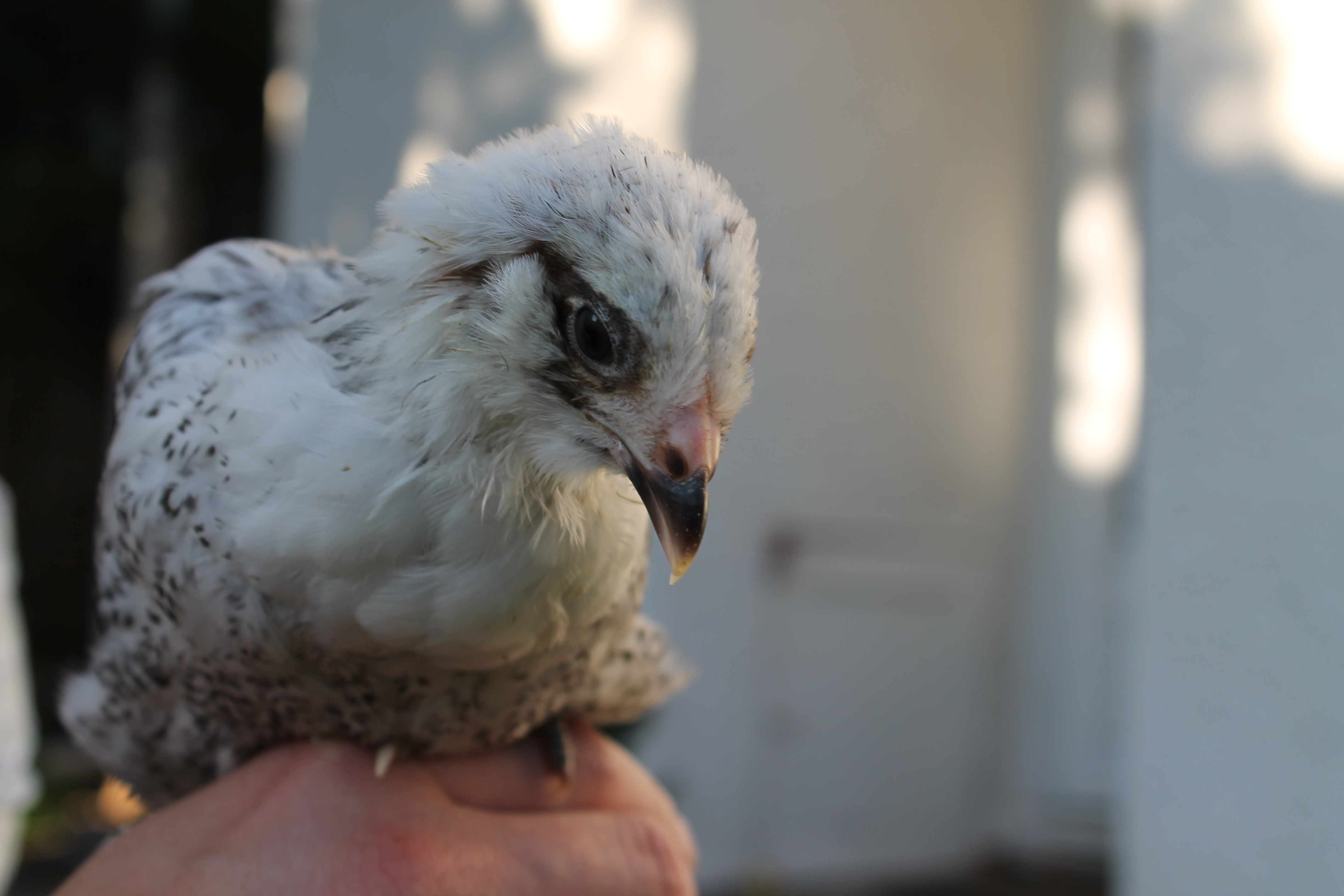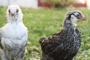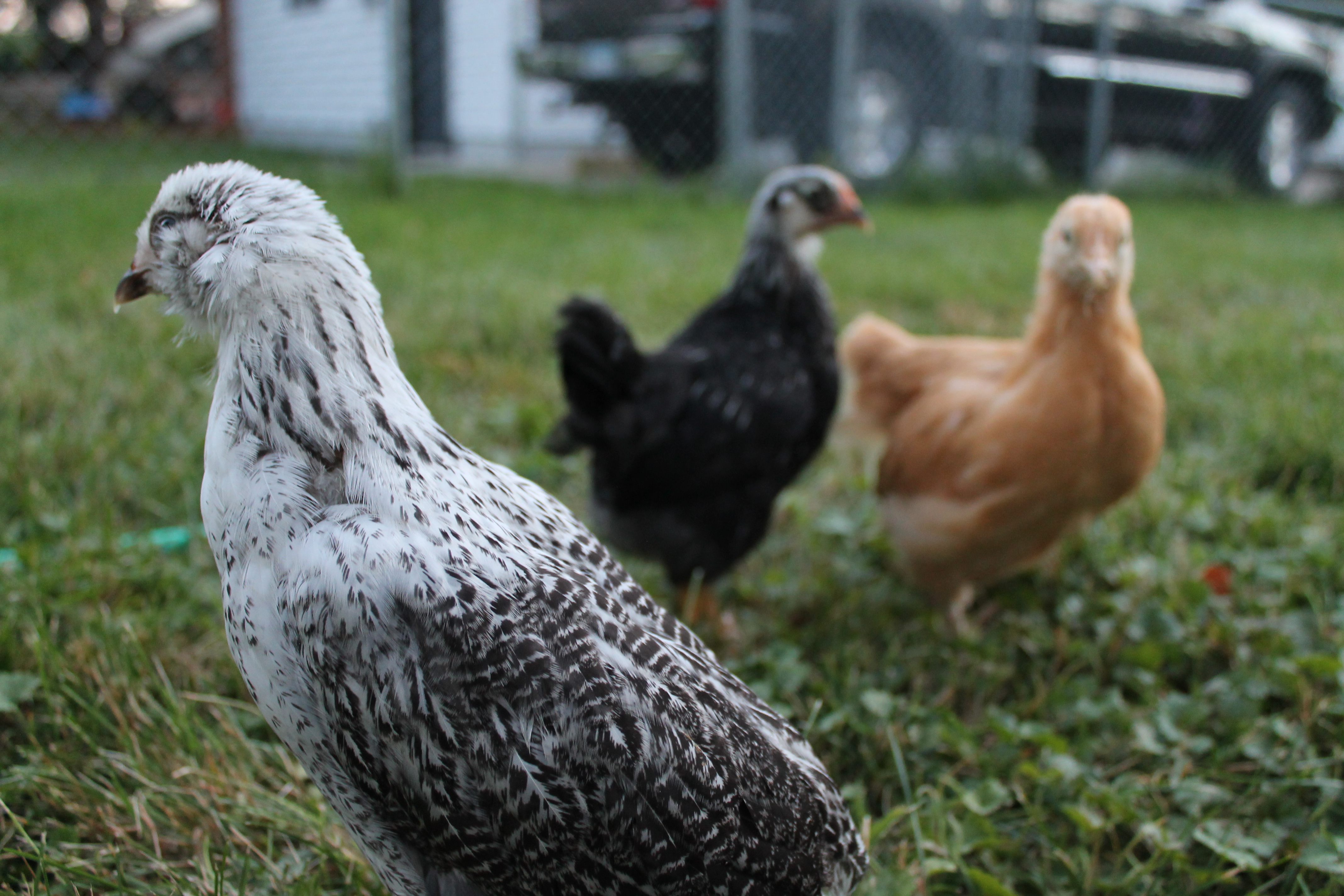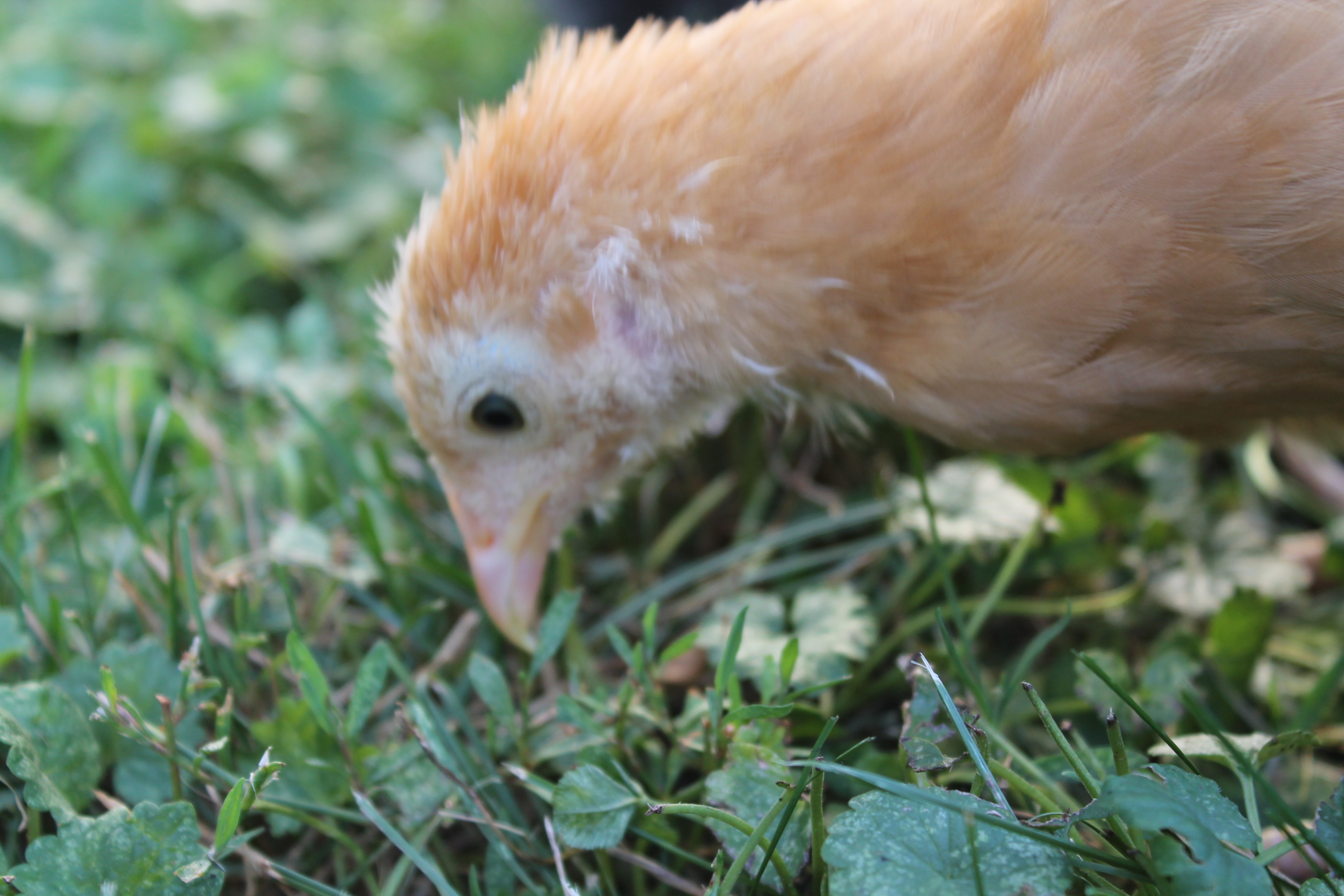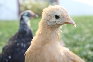 The good news is, the girls are healthy, happy and learning about the outside. We’ve been taking them out for short play dates in the yard. At first, they stuck together like birds of a feather. But after about 15 minutes, these little ladies who’ve spent their entire short lives in a bin lined with pine shavings under the red glow of a heat lamp started to move. Just a little.