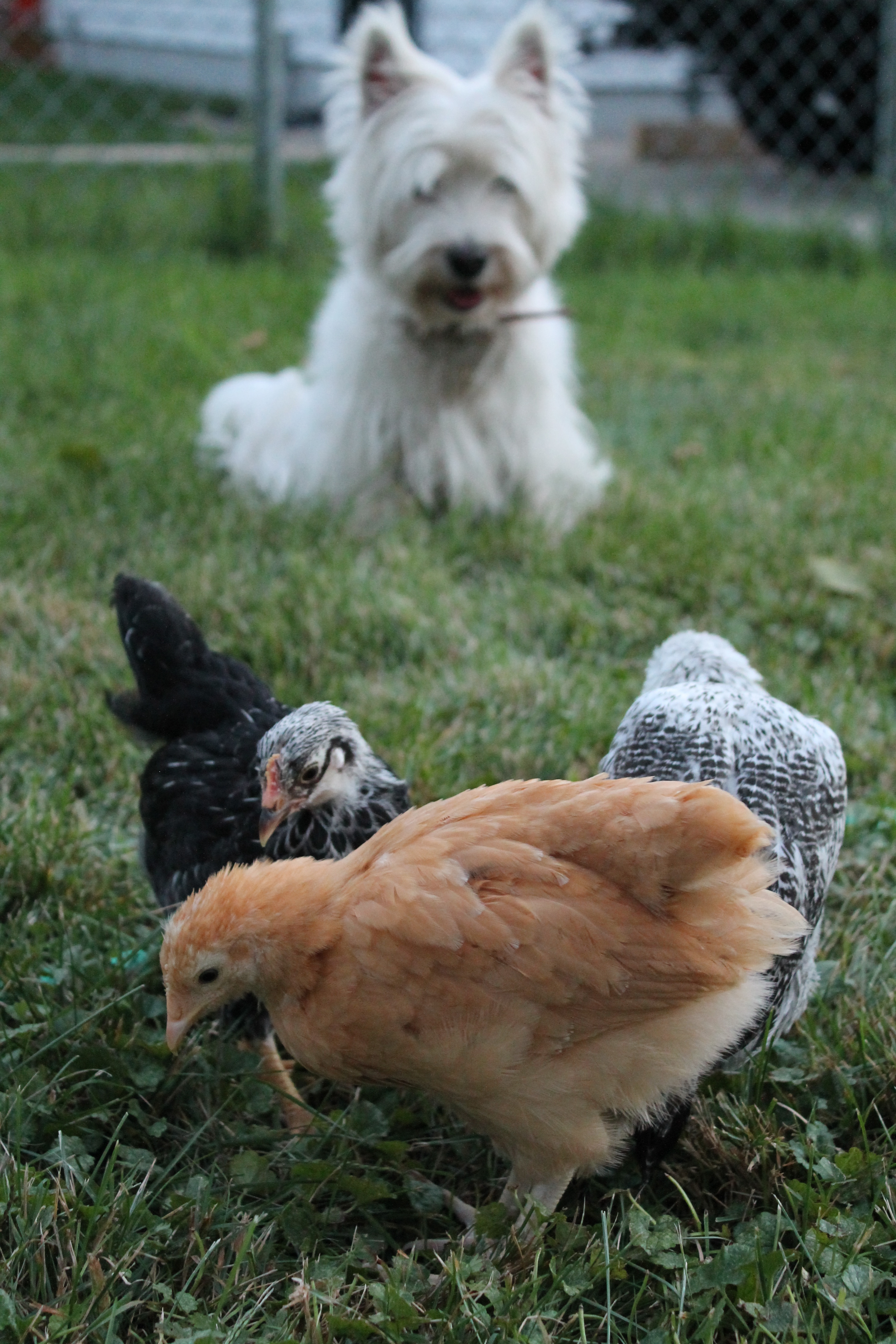 So, a few days after the chicks spent their first extended period outdoors, we decided to give it another go. This time populating the lawn with three birds, two humans and a West Highland White Terrier.