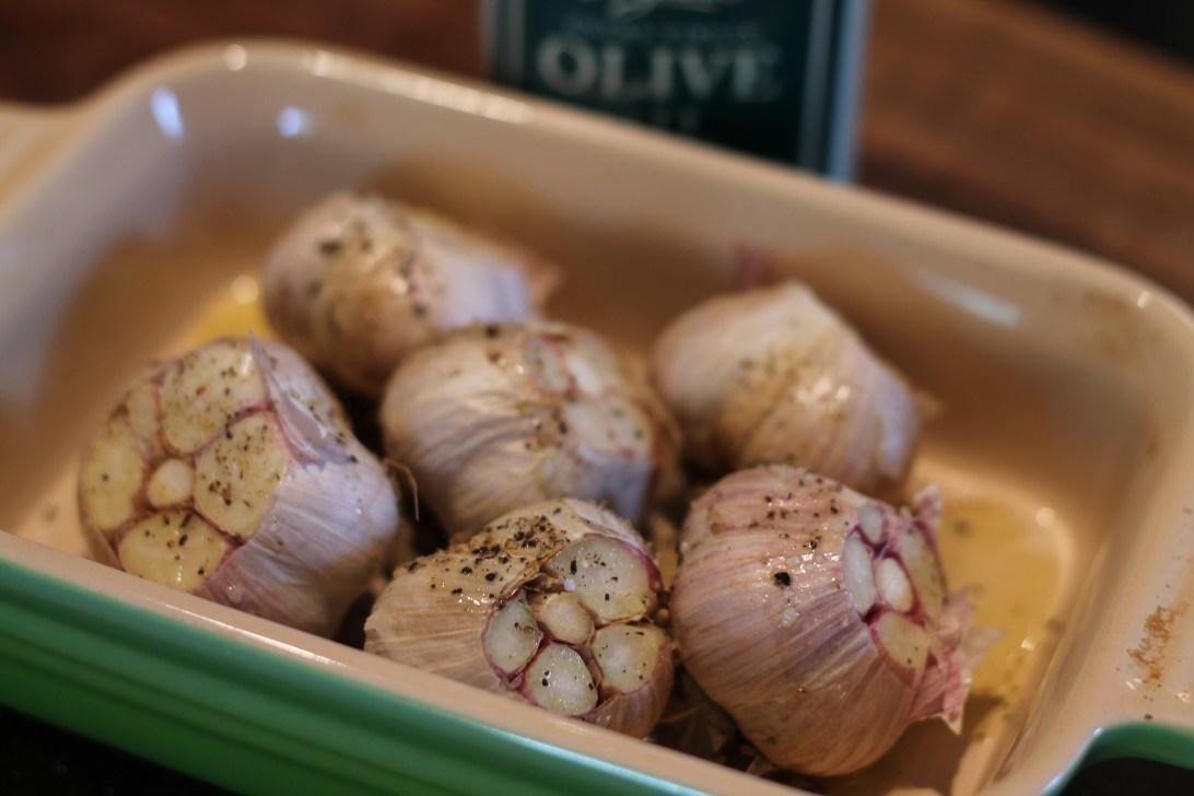 Raw garlic with olive oil, salt and pepper