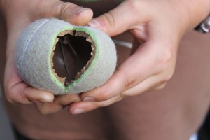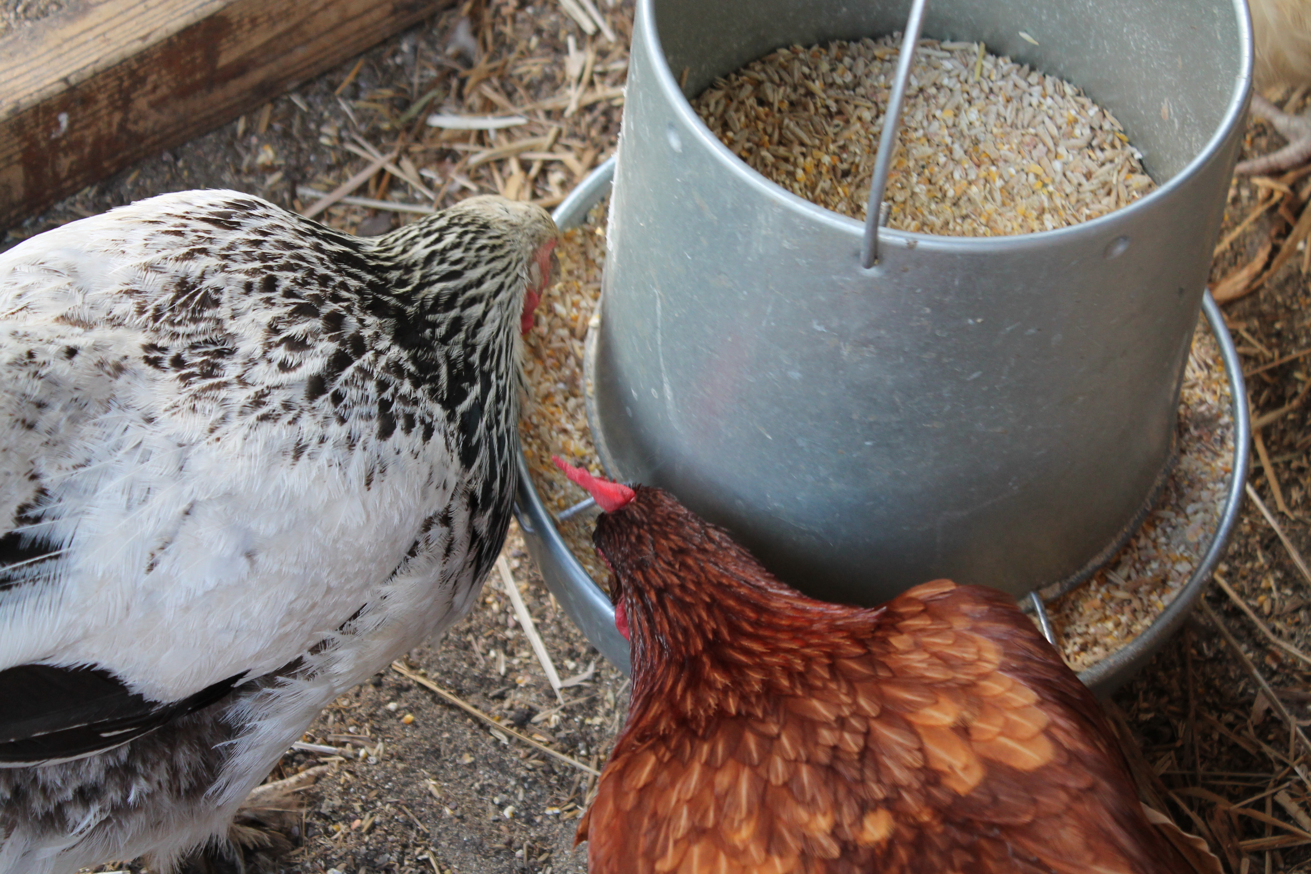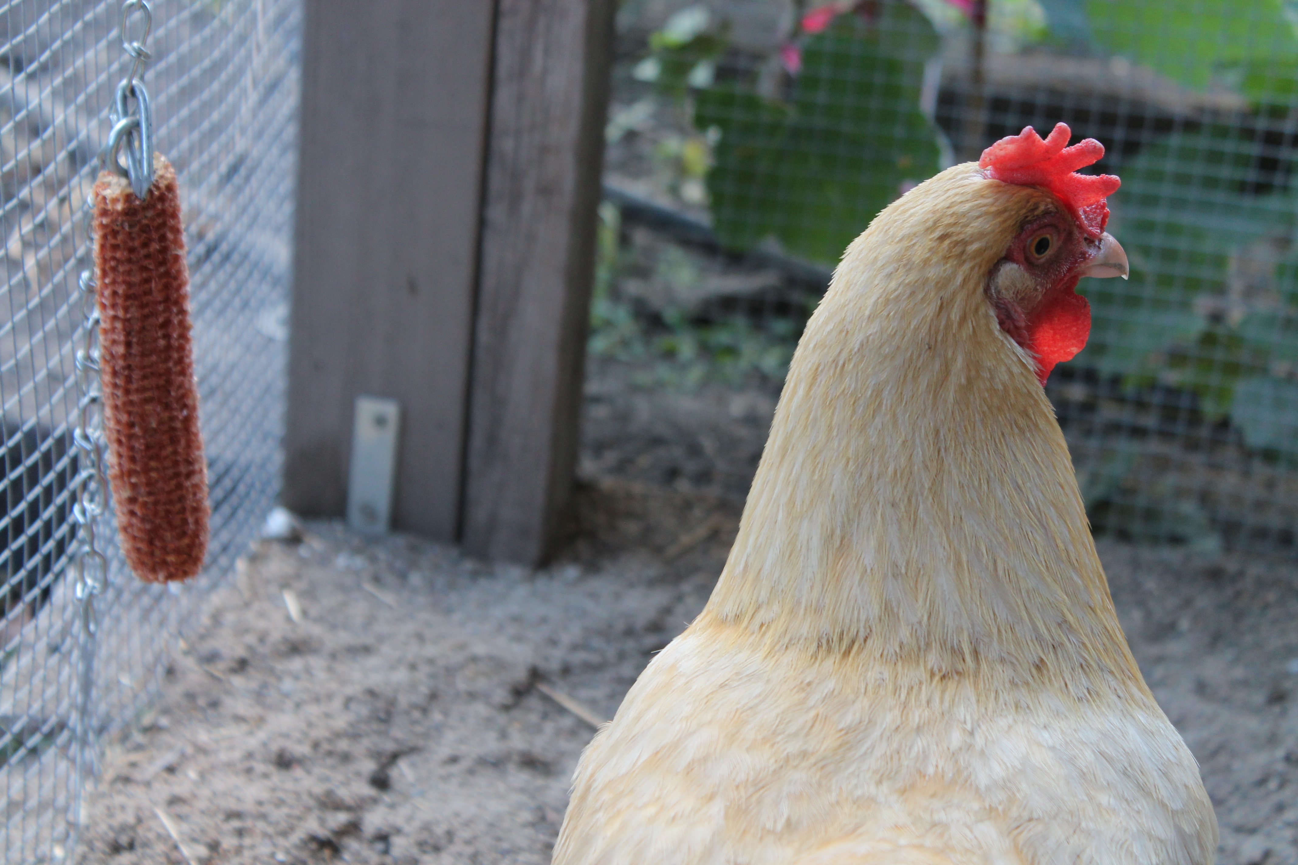 He cut a slit in a tennis ball and attached string to the other side. He fills the ball with chicken feed, lets it bounce back closed and hangs it from the family swing set. The hens love to peck at their chicken pinata, rewarded by treats falling into the grass for them to snap up with their beaks. Brilliant!