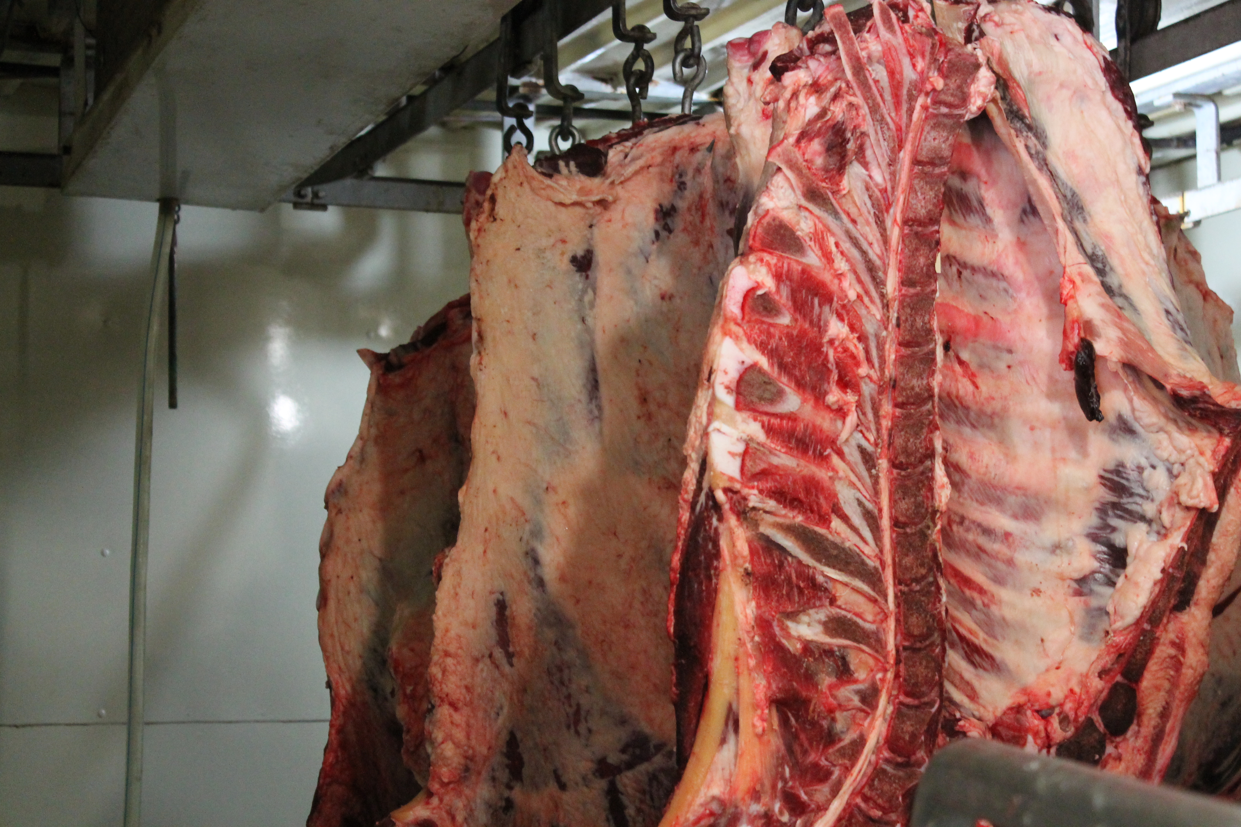 And the split sides of beef hang in this cooler until they are butchered into steaks, roasts and ground beef.