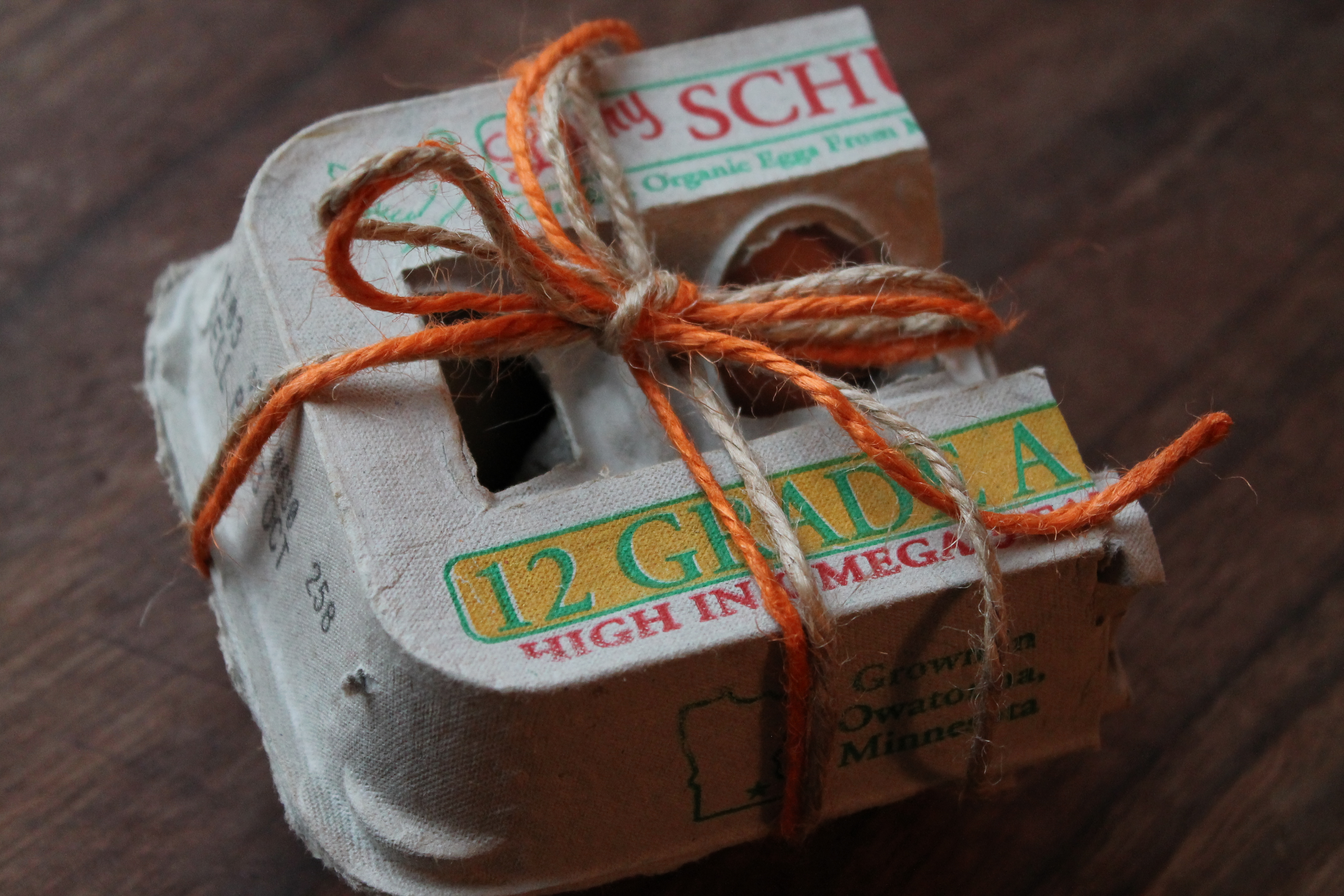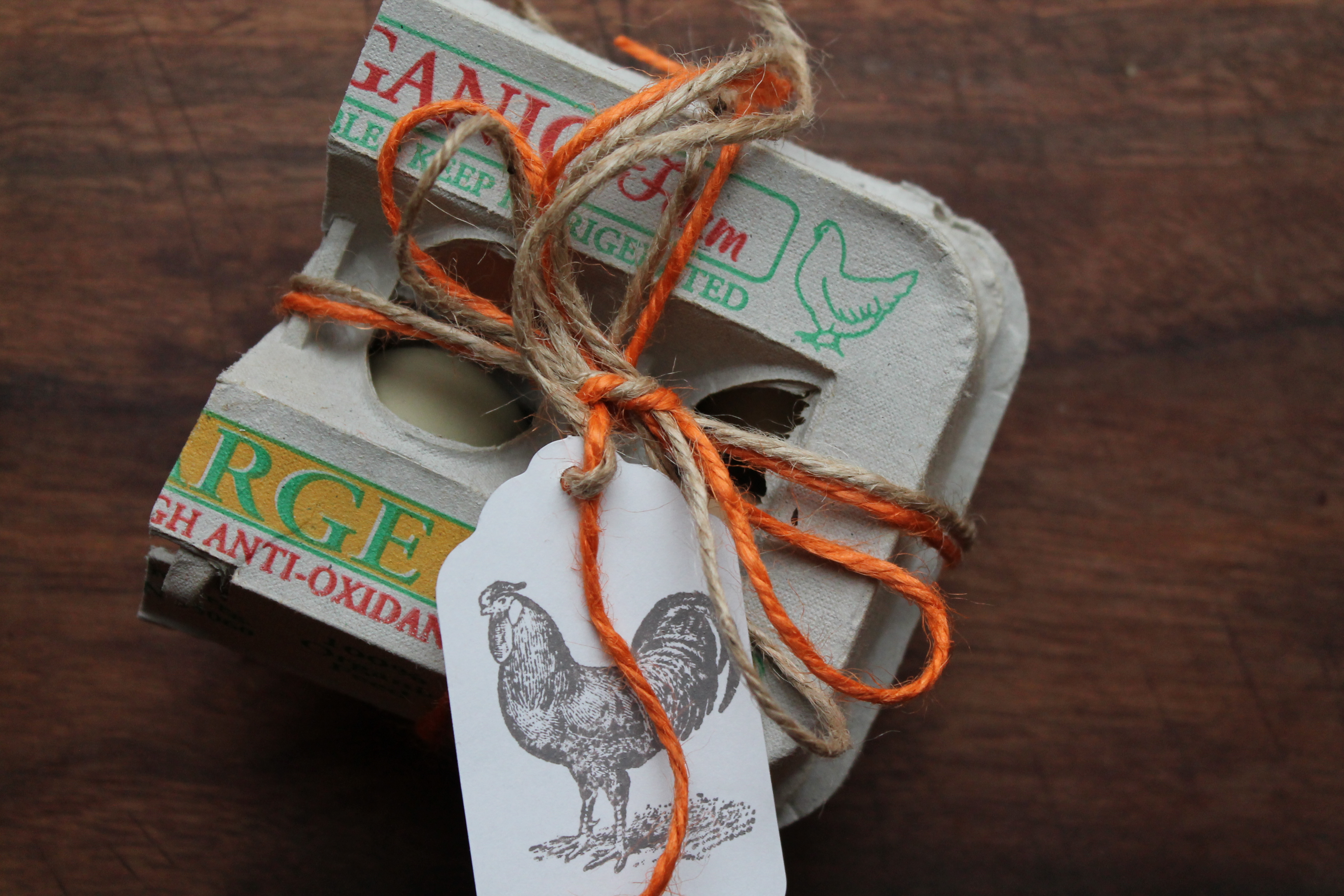 I utilized some of my holiday wrapping to put together lovely four packs of eggs. I’ve been saving cartons from the grocery store for months and cut them into thirds. Carefully making sure each small carton contains a variety of colors, I placed the eggs inside and closed the top.