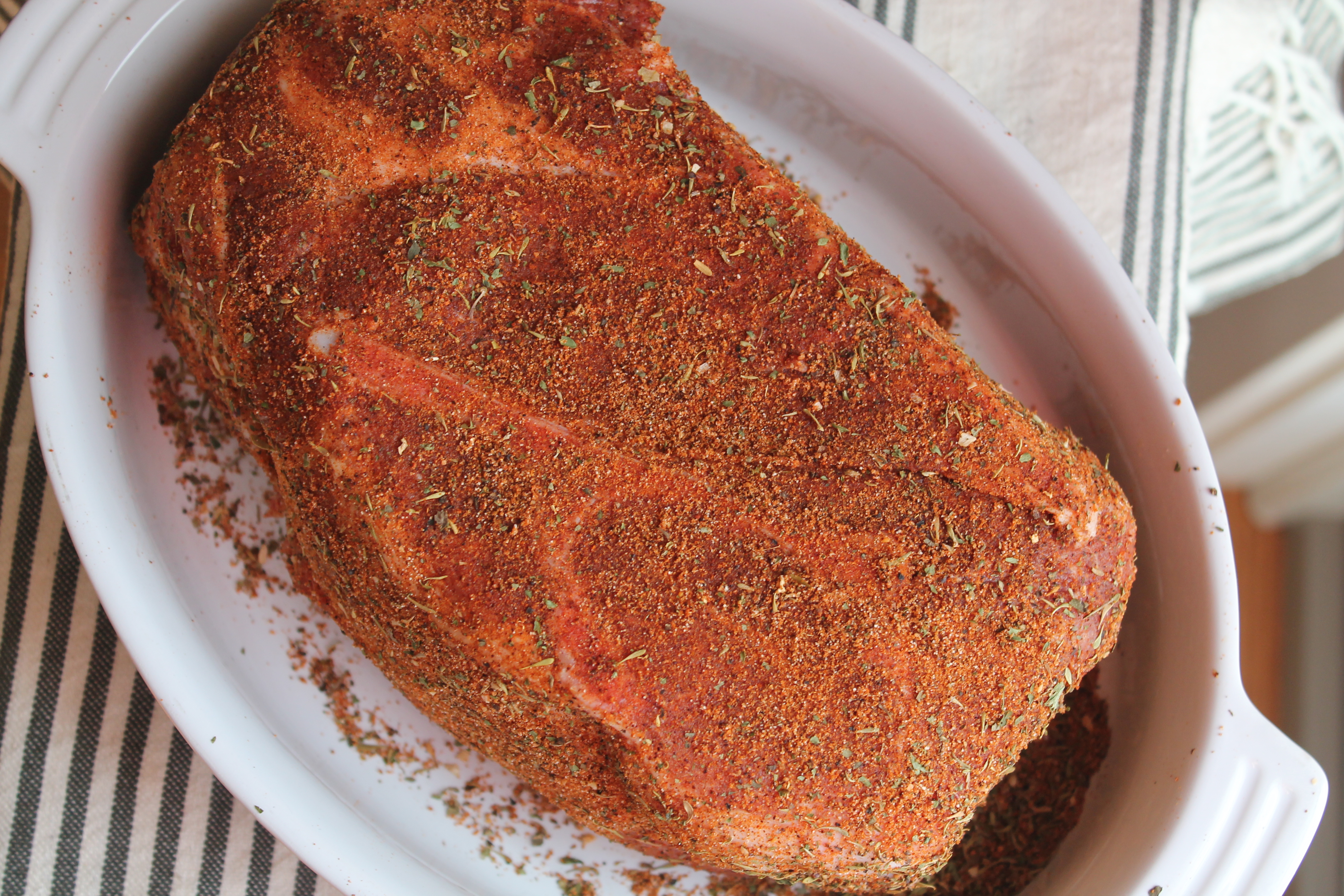 Pat your seasoning of choice onto the pork, evenly coating all sides. In the meantime, splash a tablespoon of olive oil in the insert of your slow cooker (if it’s safe to use on the stove) or a large skillet.
