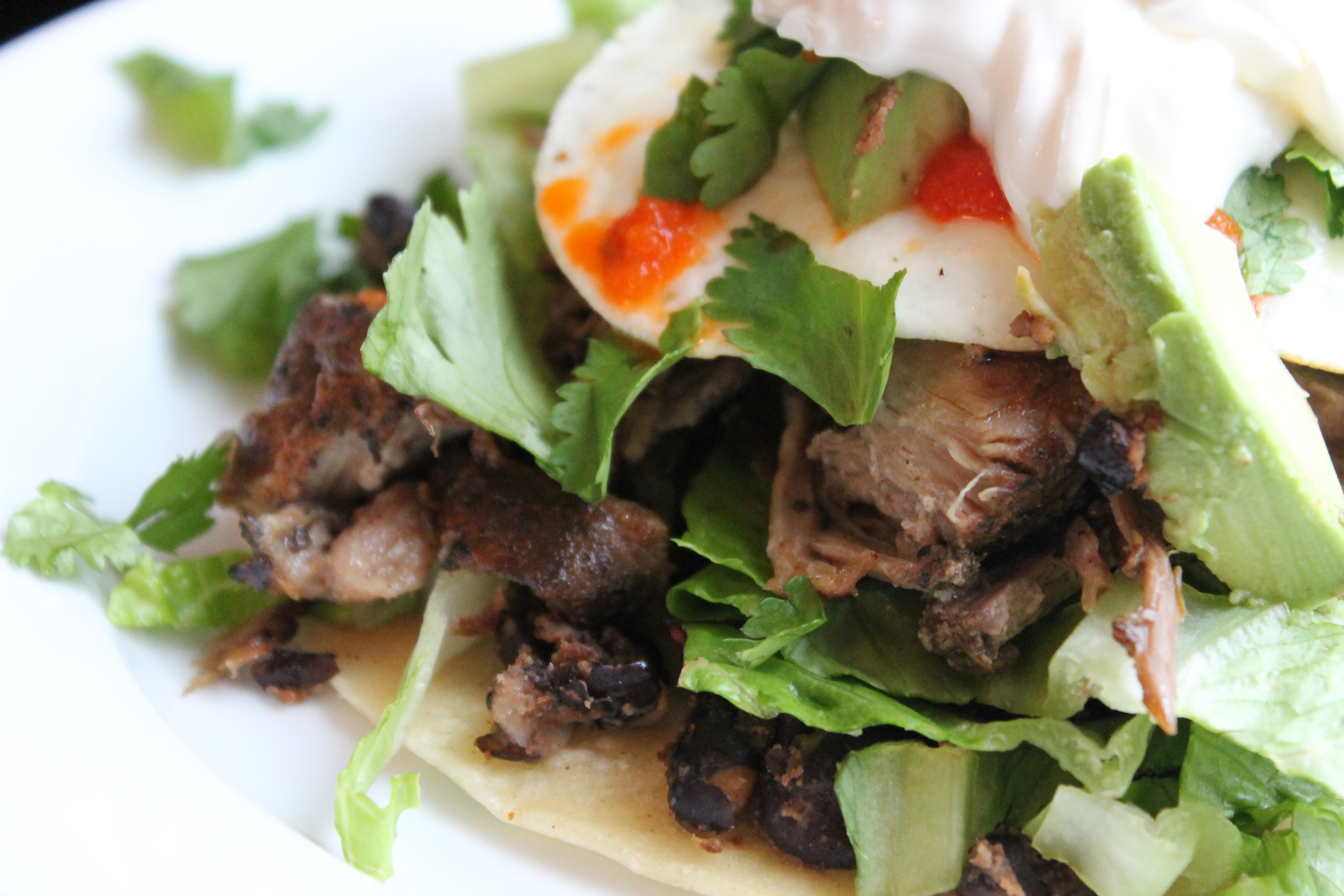 Top the tortilla with beans, pork and romaine. Gently place the egg on top of the tostada and garnish with sour cream, avocado, cilantro and hot sauce.