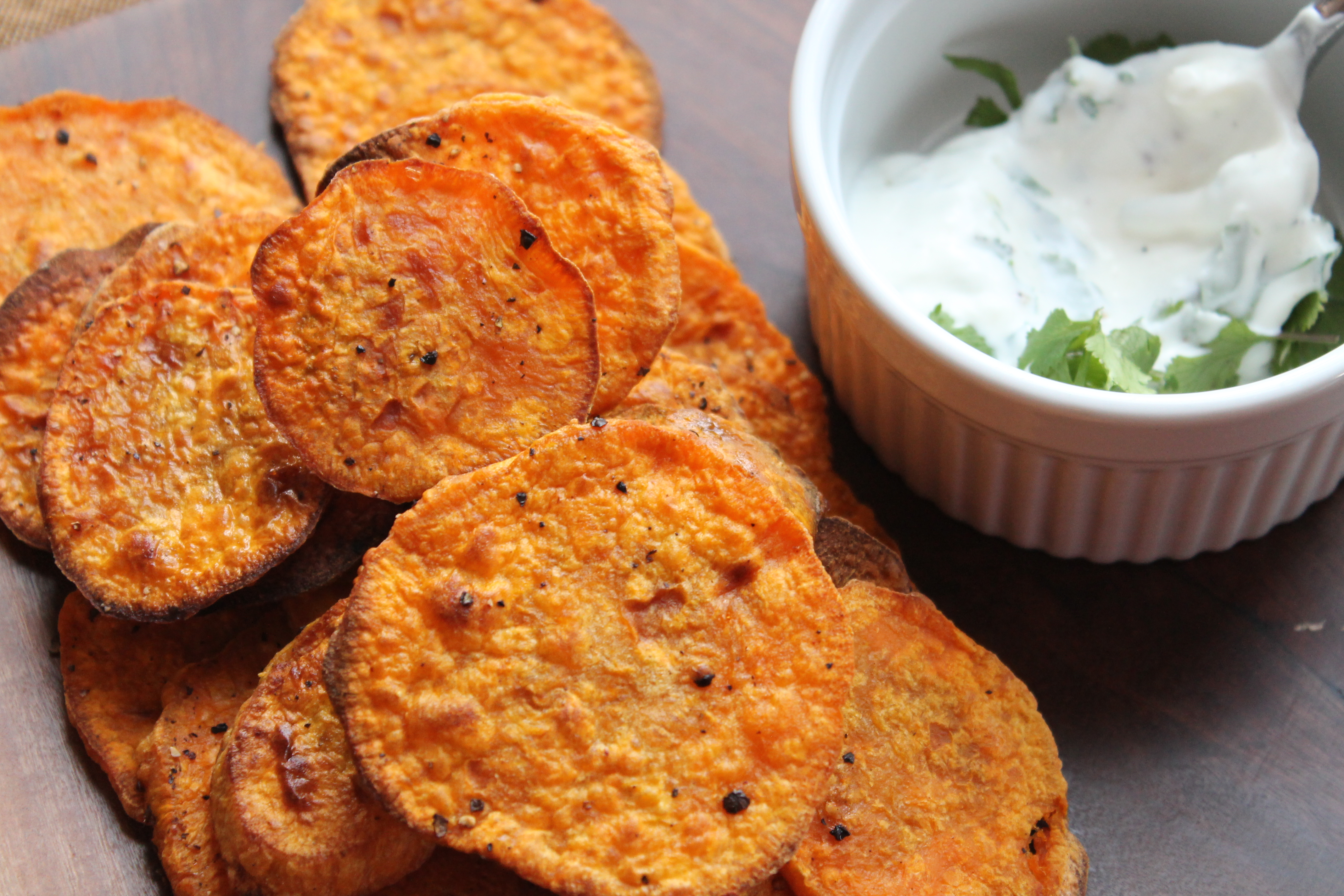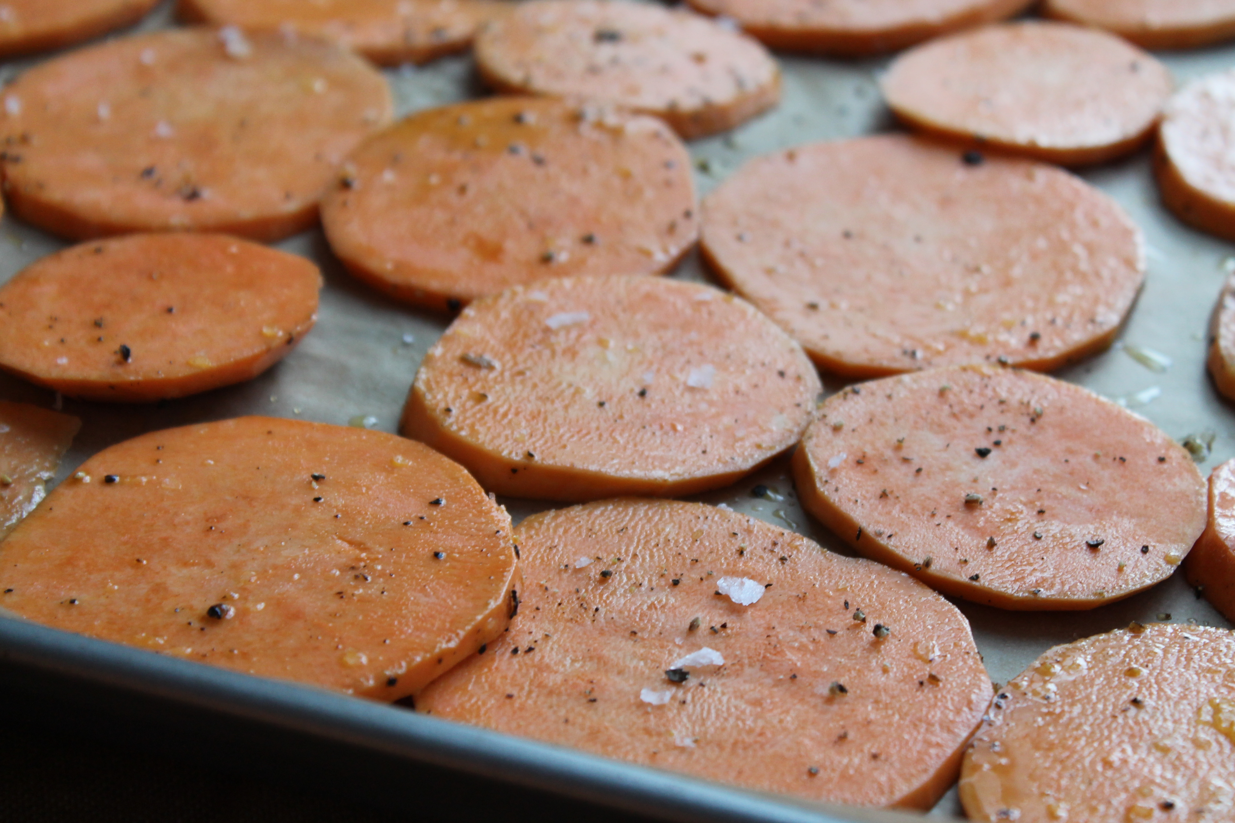 While you strain the yogurt, peel and cut the sweet potato into 1/4 inch slices.