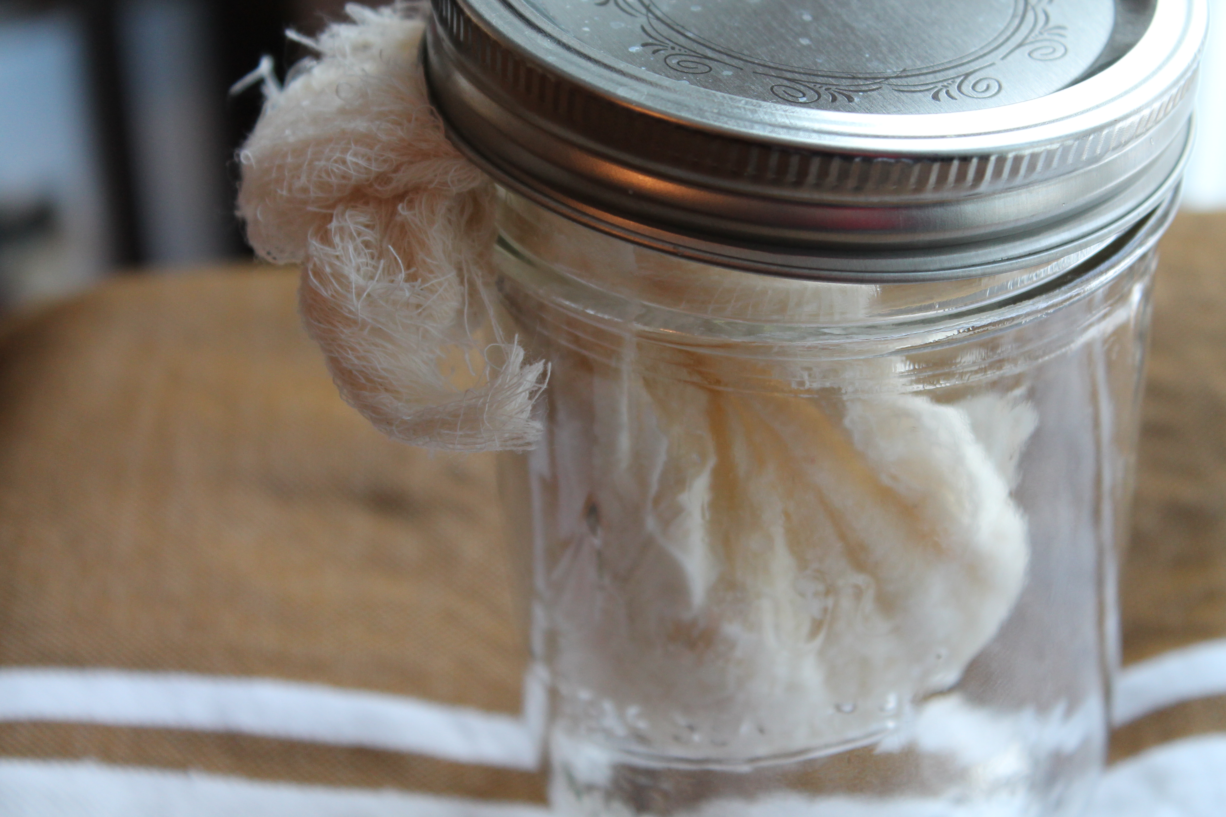 Alternatively, take the package and let the corners of the cheesecloth hang over the edge of a mason jar. Screw the lid on the top of the jar, holding the yogurt up so the liquid can drain out below.