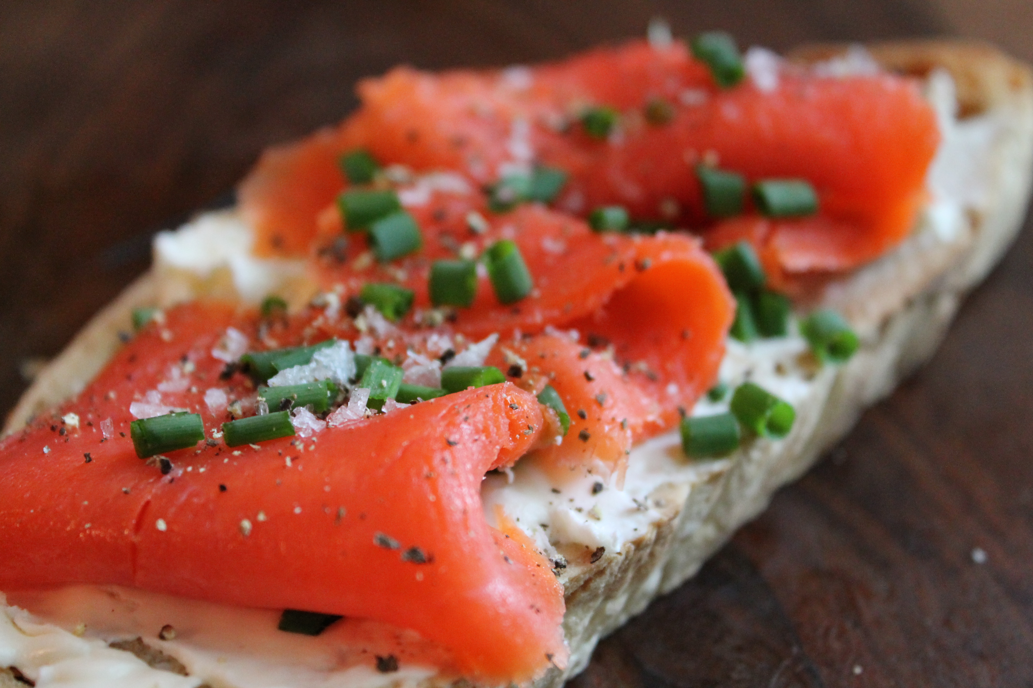 Homemade bread topped with cream cheese, chives from the garden, smoked wild Alaskan salmon, Maldon salt and pepper. Savory, salty breakfast of choice.