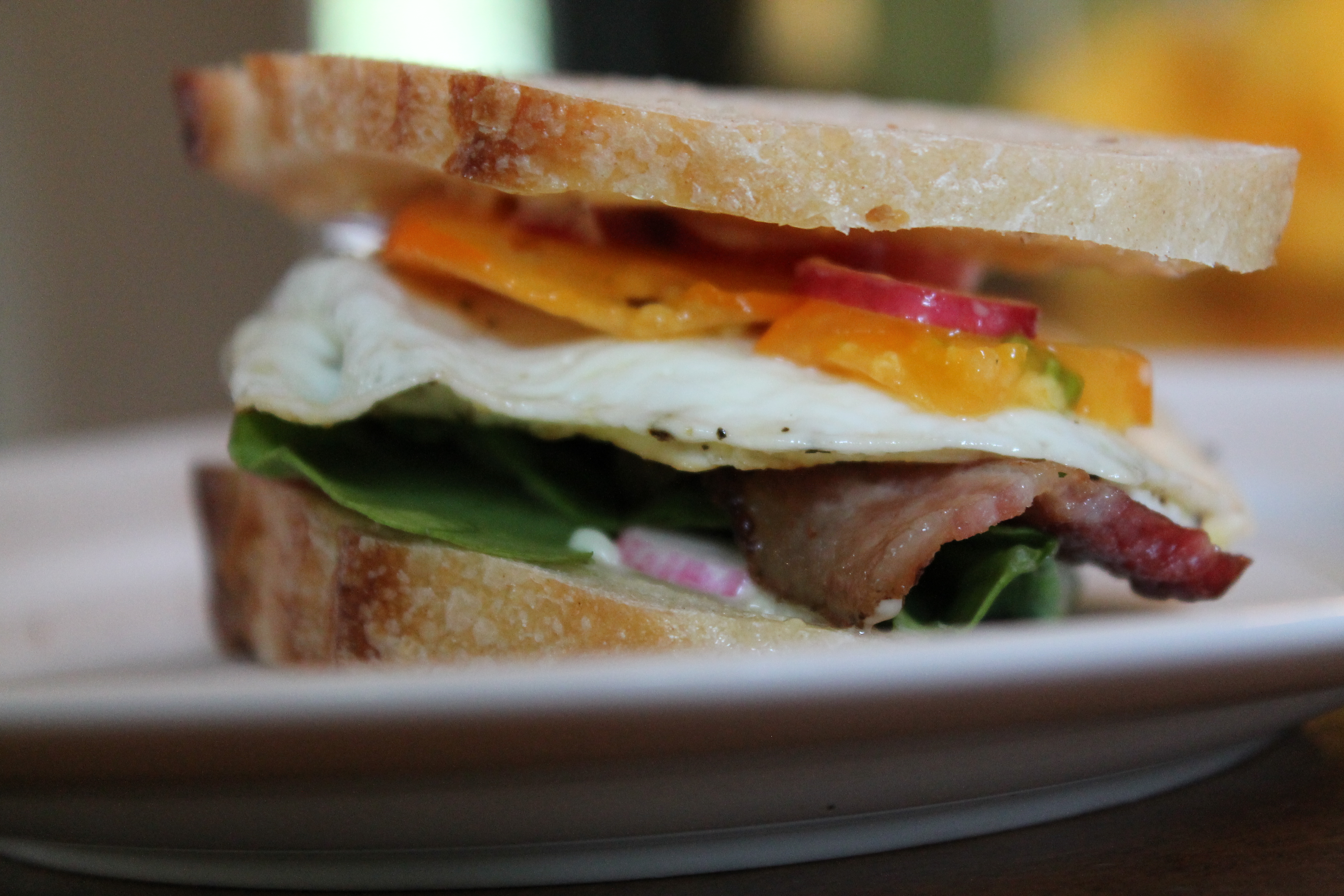 This version? A BLERT. As in – bacon, lettuce, egg, radish and tomato. Slathered with homemade mayo. Cradled by two pieces of roasted garlic sourdough bread straight from the farmer’s market.