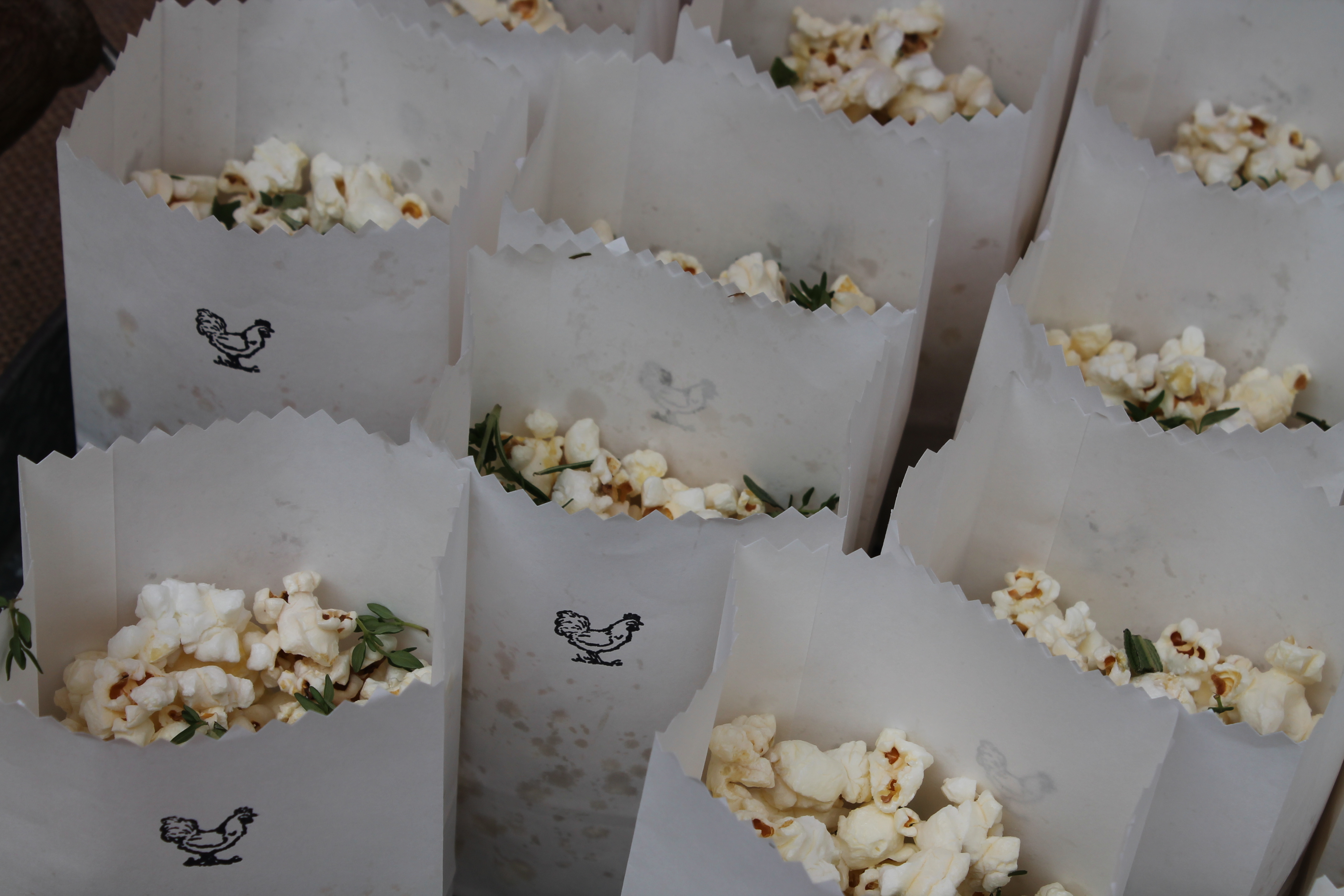 Crunchy popcorn studded with fresh herbs in white paper bags adorned with darling little chickens.