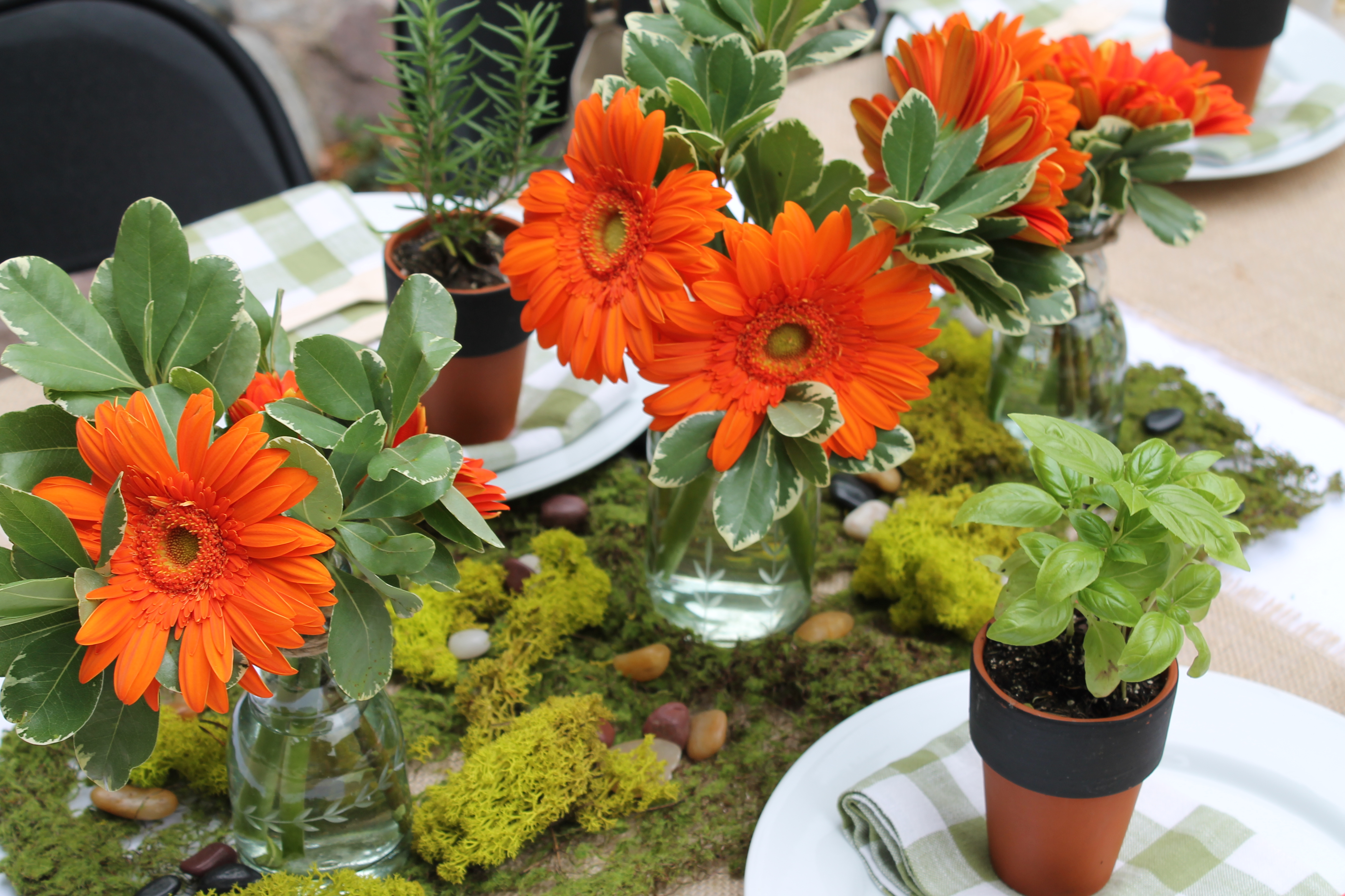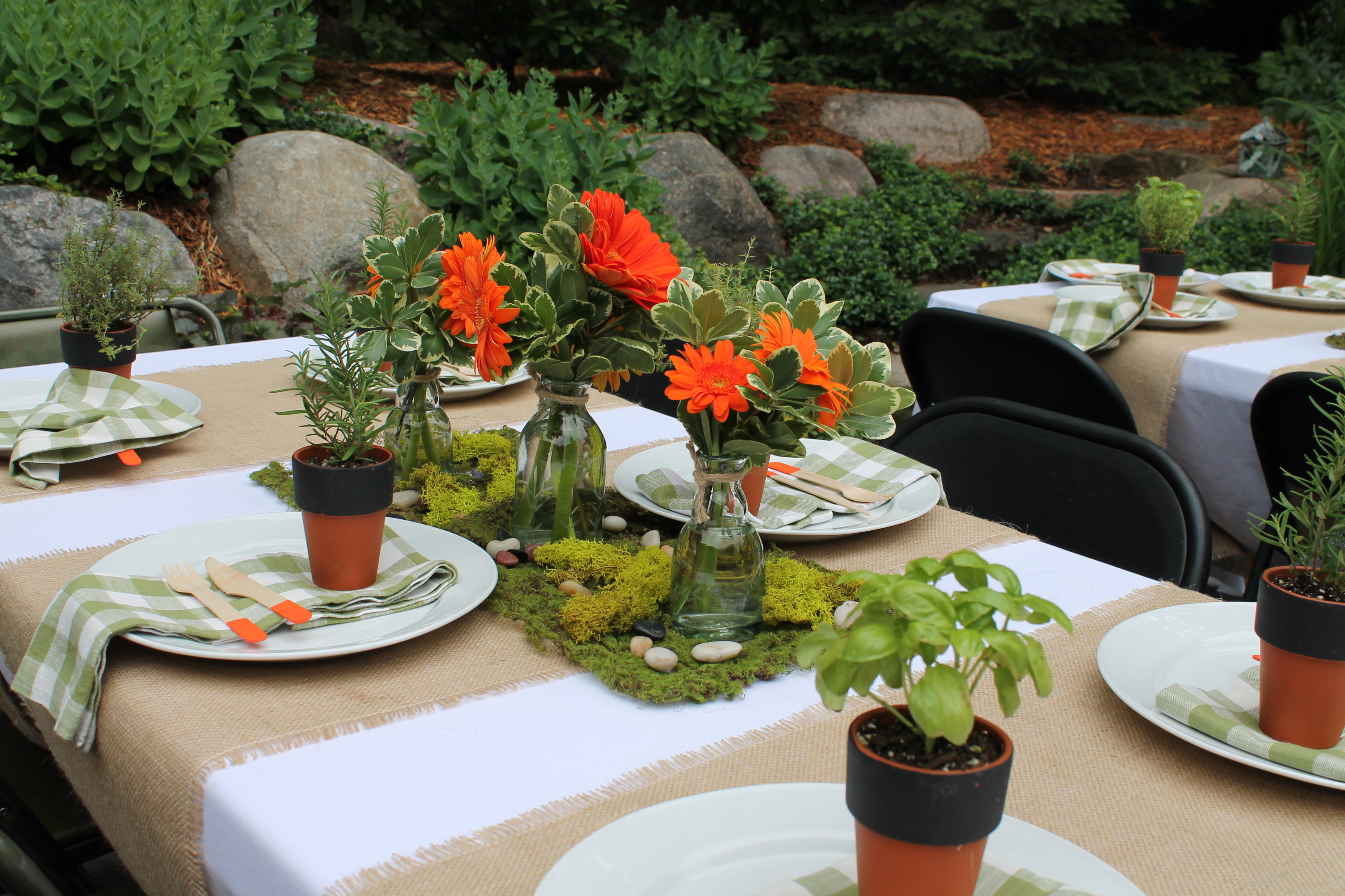 Beautiful tables with place settings marked with a pot of fresh basil, thyme or rosemary for guests to take home.