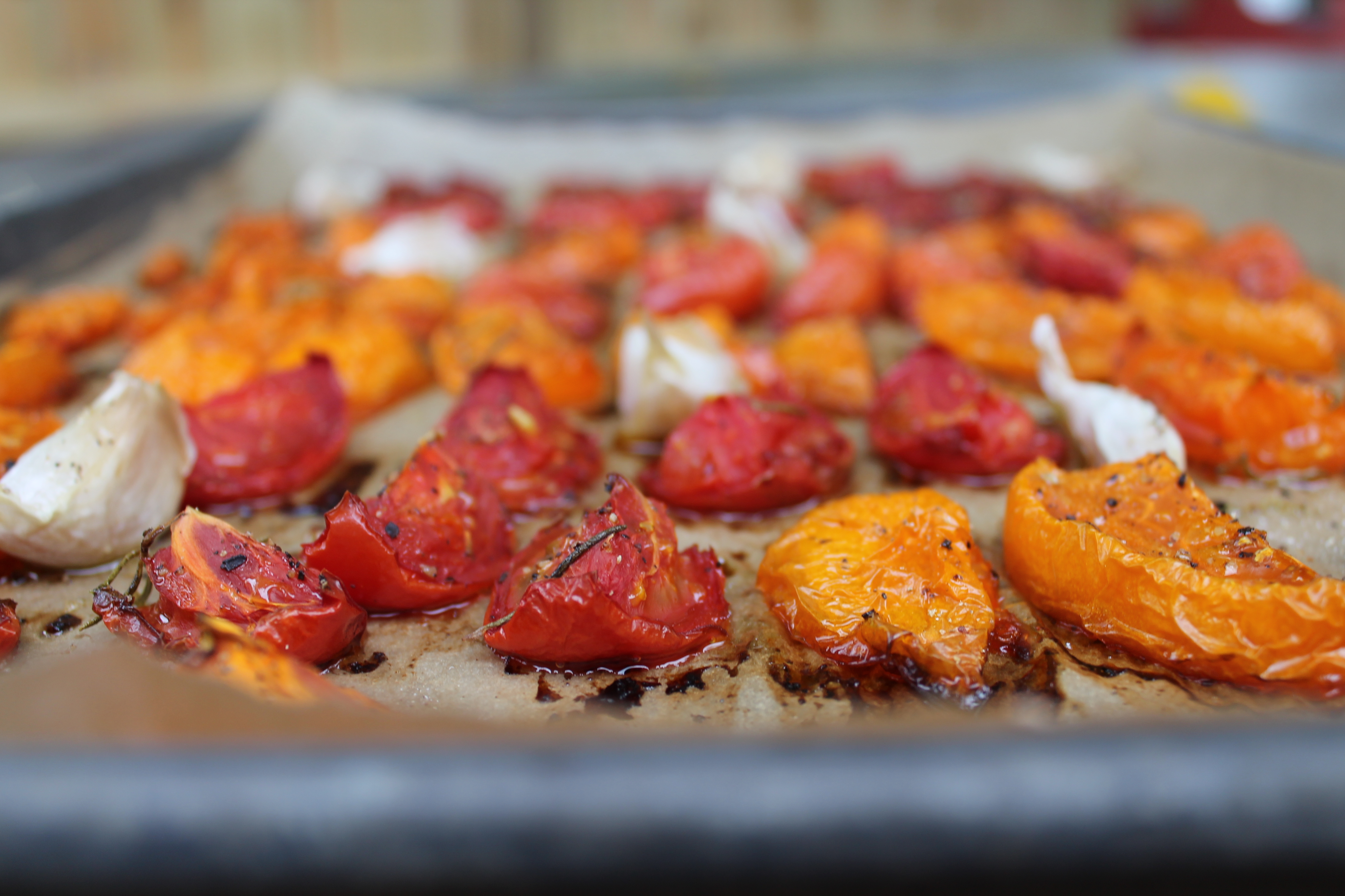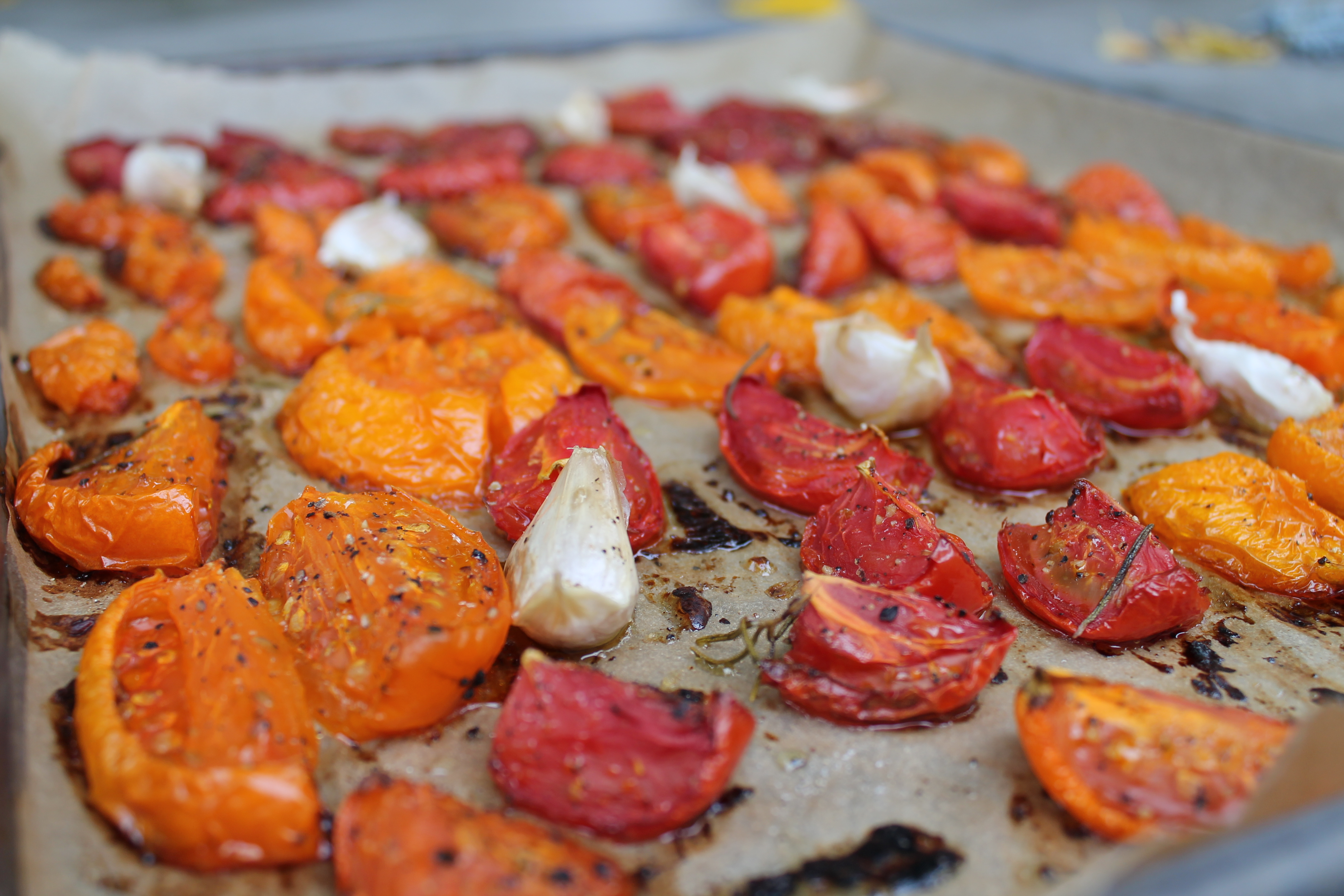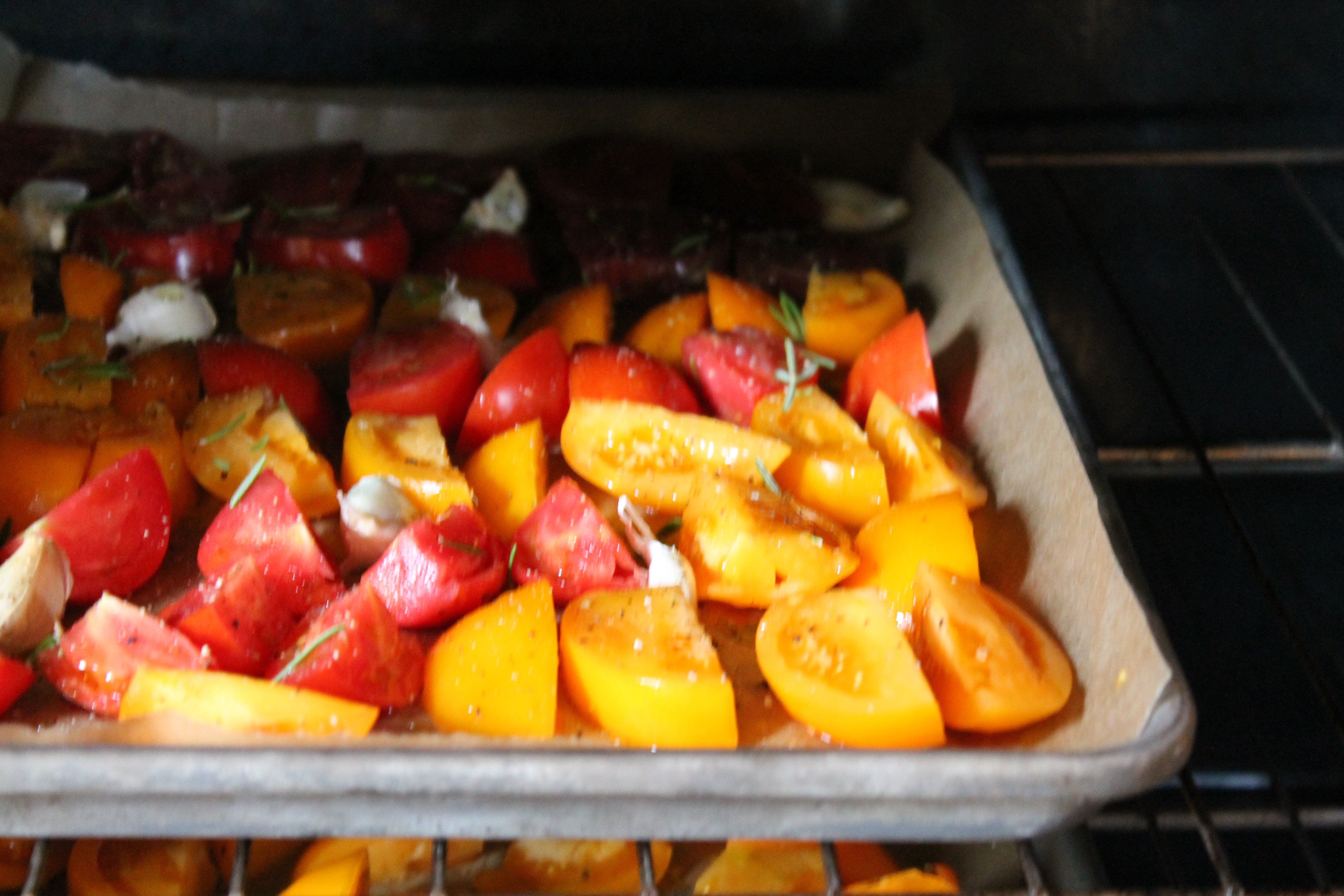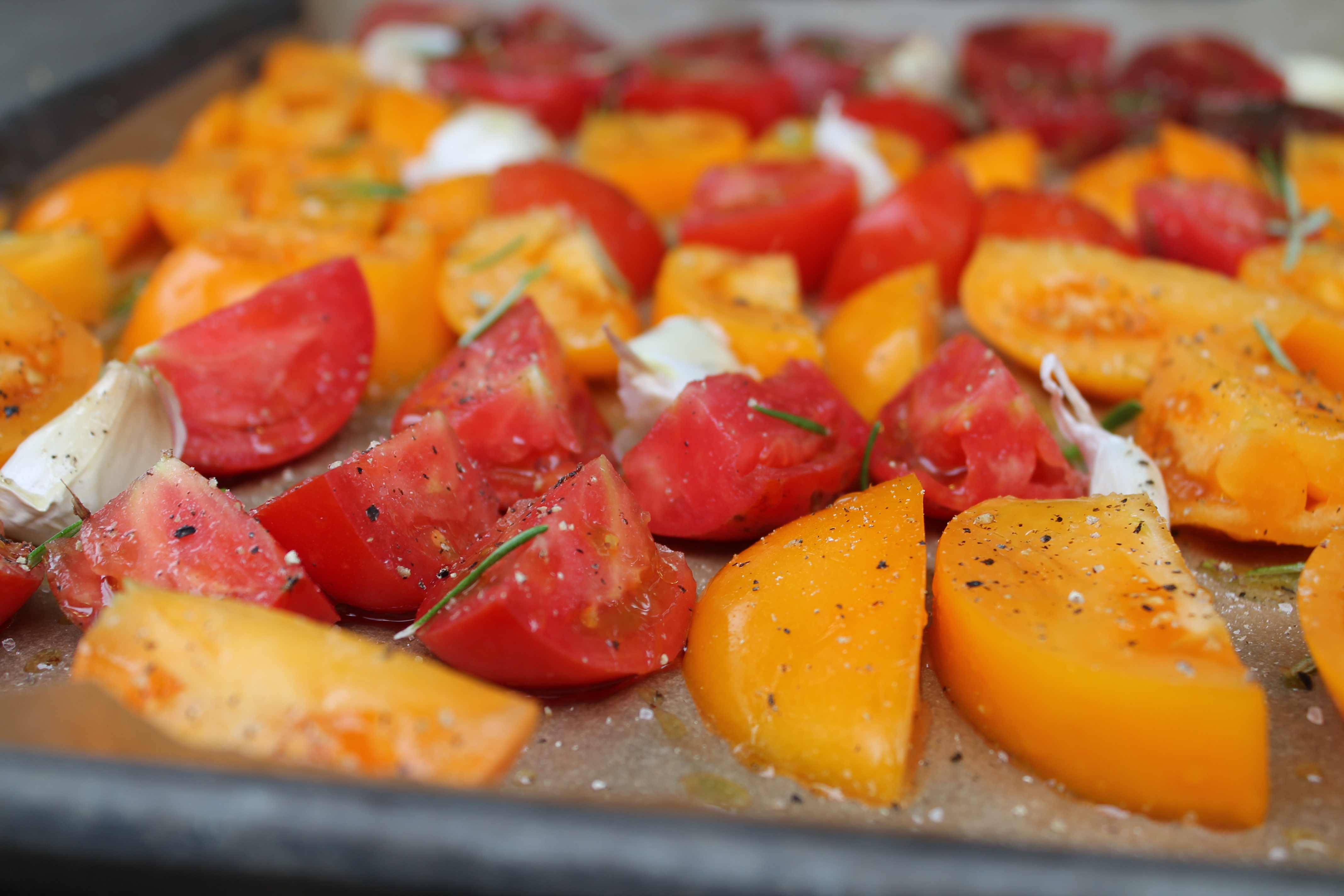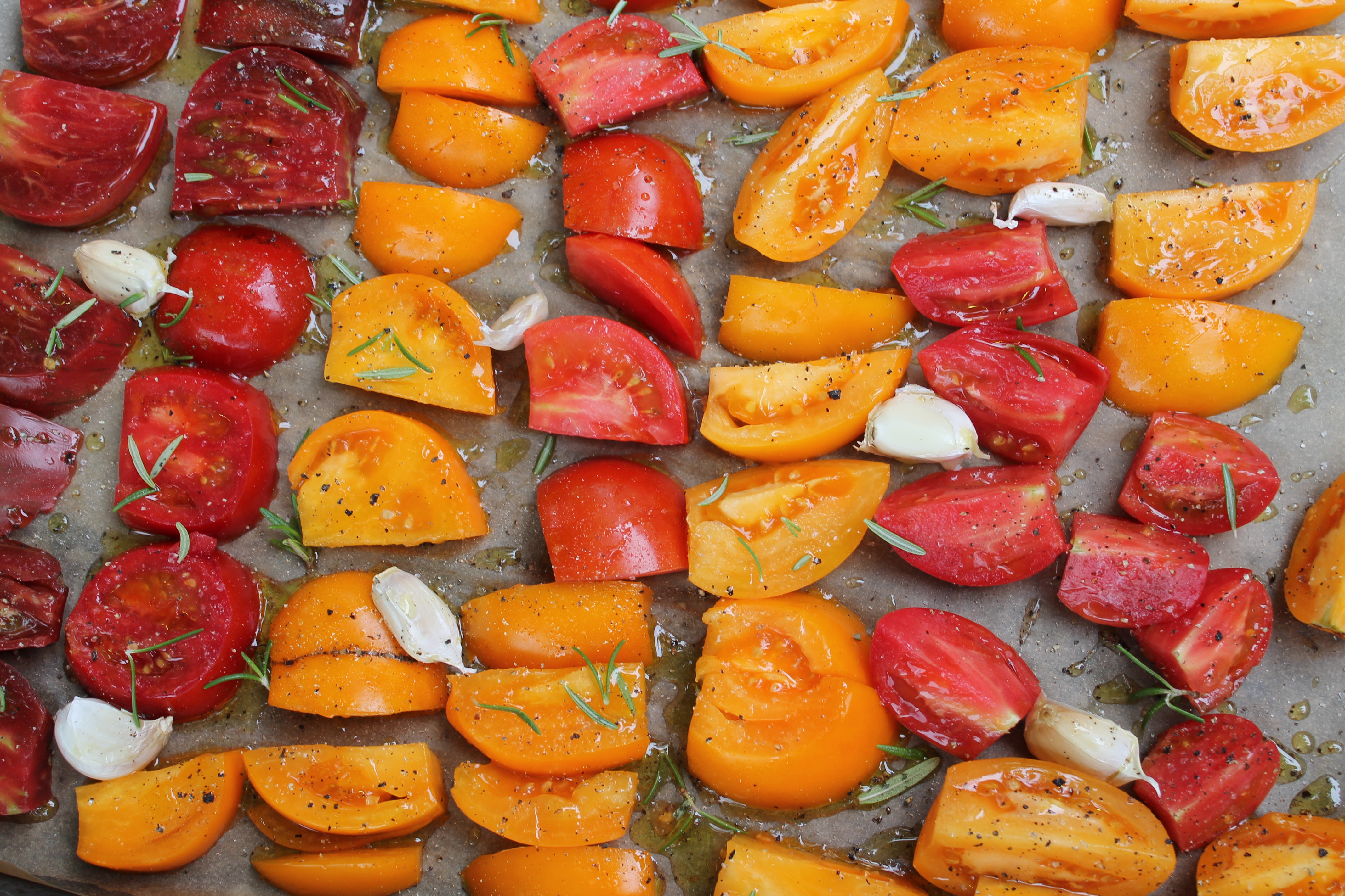 Cut tomatoes into evenly sized pieces and arrange in an even layer on a baking sheet with garlic cloves, herbs, salt, pepper and olive oil.