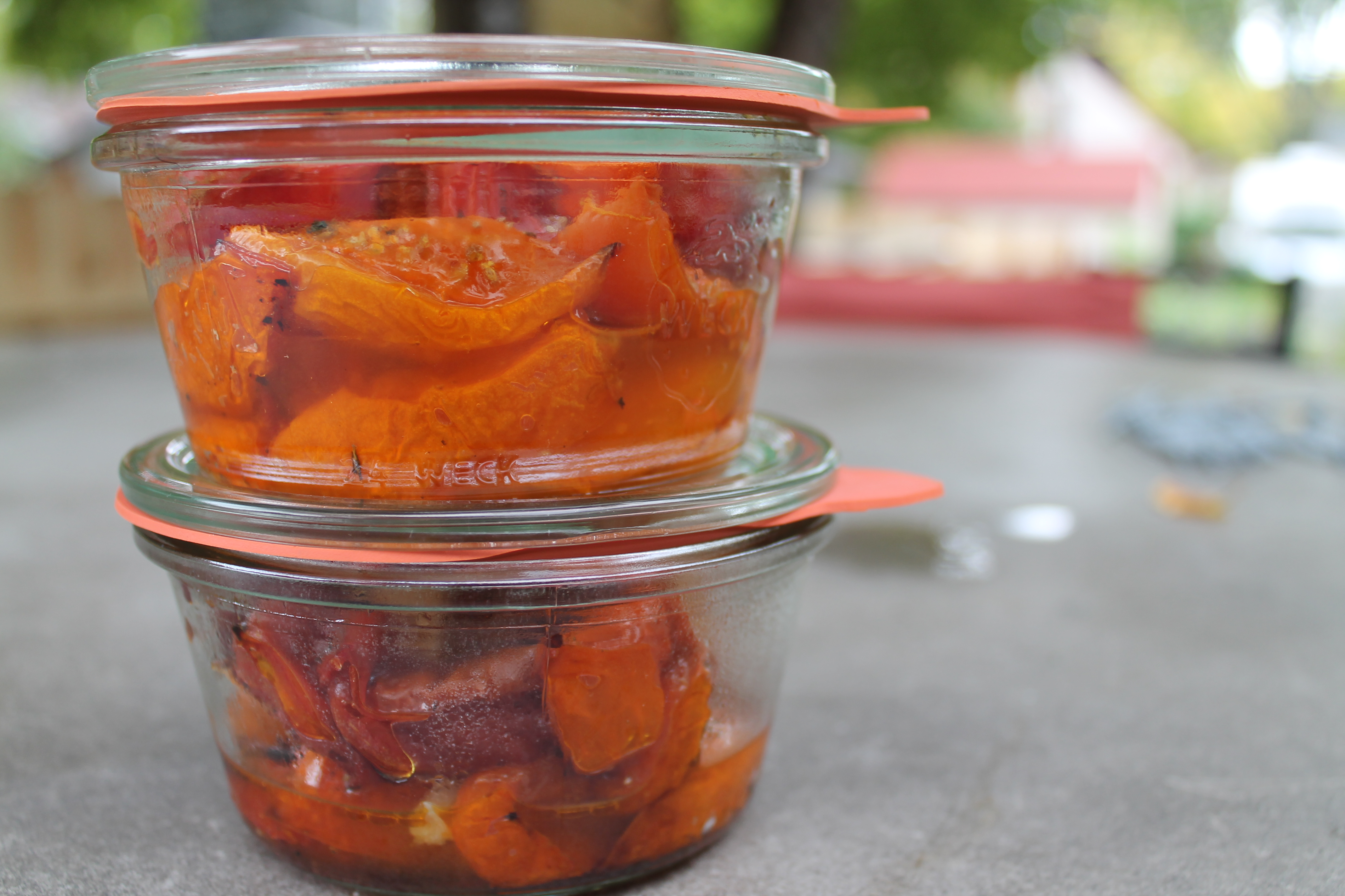 Roast for between 2 1/2 and 3 hours, until tomatoes are wilted and juices are browned on the bottom of the pan. Let cool in pan and transfer to jars or other containers.