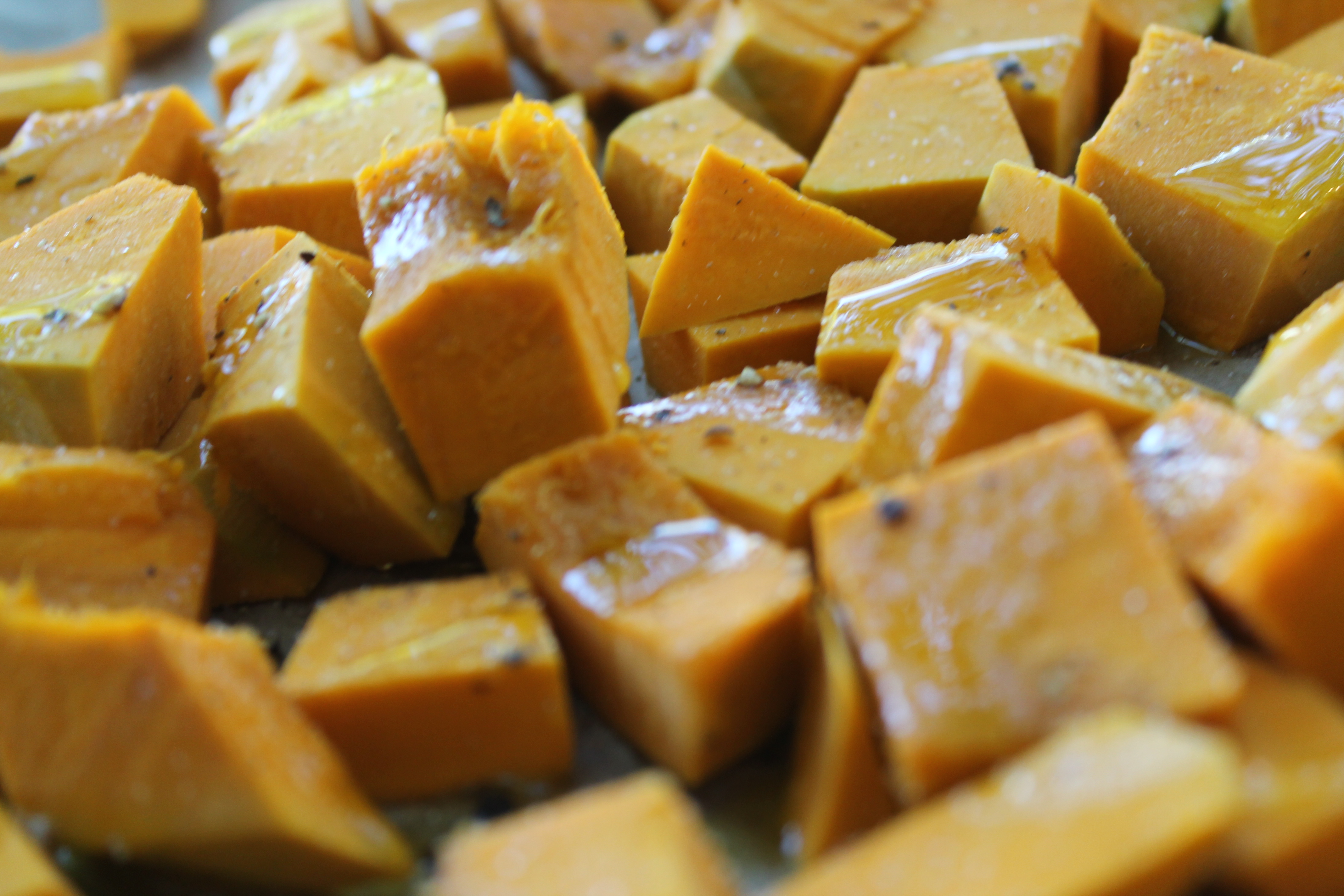 Toss squash in 3 tbsp olive oil to coat. Season with salt and pepper and arrange on two parchment lined sheet pans. *
