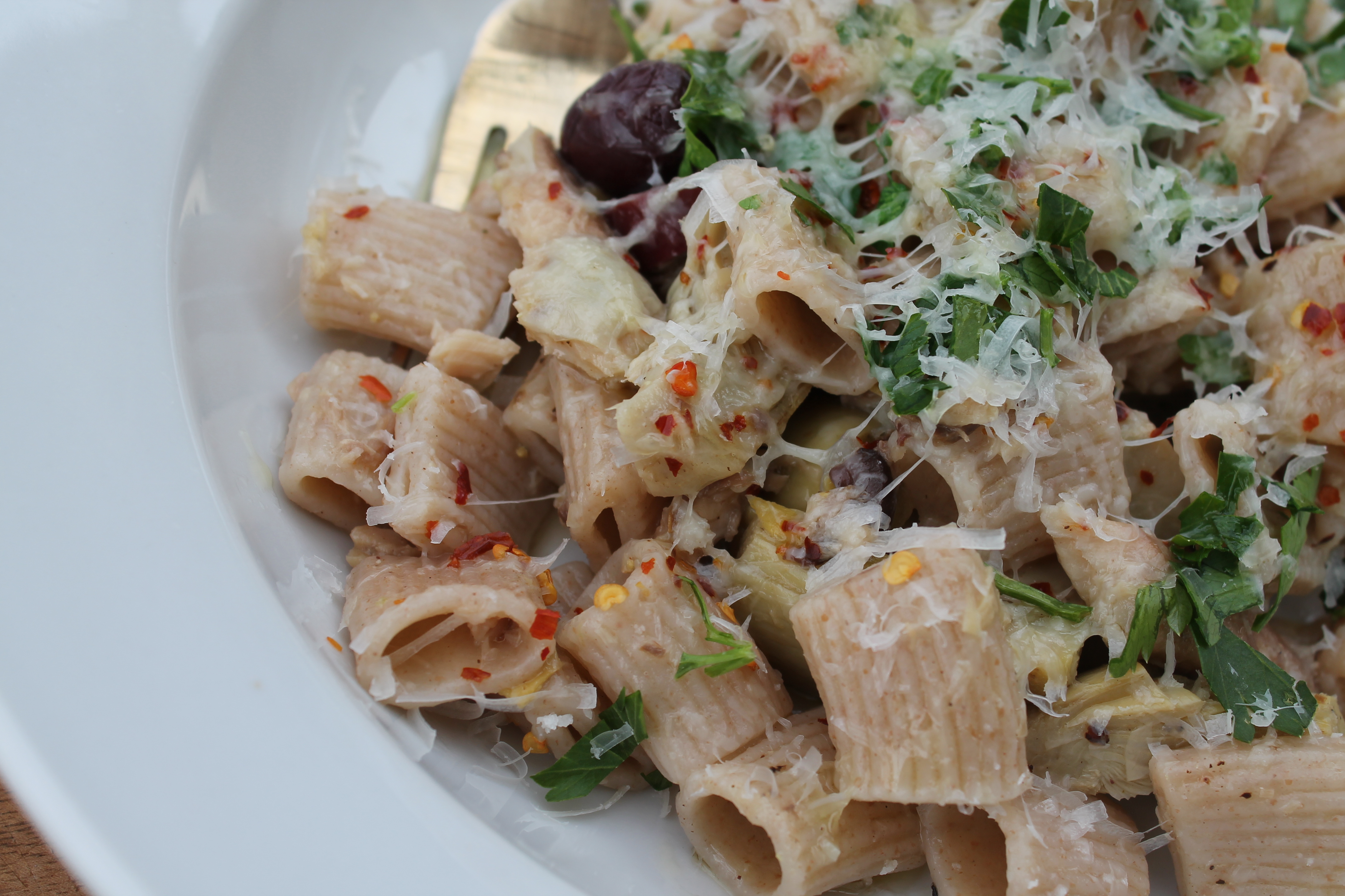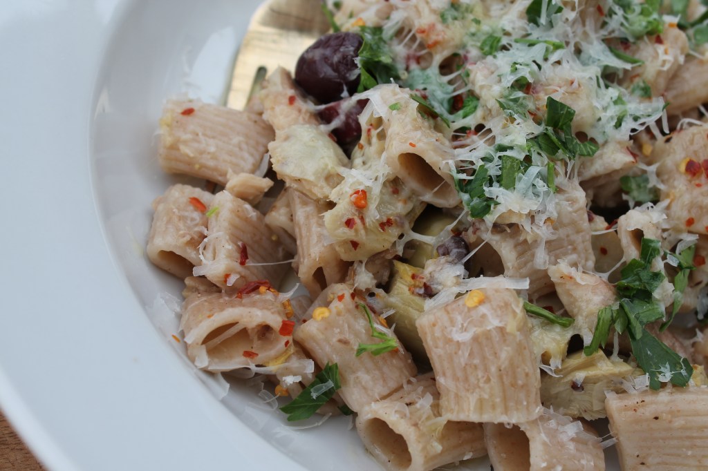 Bring water to a boil and cook pasta according to package instructions, reserving 1/3 cup of the starchy pasta water before draining. In a large skillet, sauté the onions and garlic in the olive oil over medium heat until fragrant and translucent. Add the sardines and the oil, breaking up with a wooden spoon. Add the artichokes, olives and pasta, stirring to coat. Pour in the pasta water and add the lemon juice and zest. Turn off the heat and serve (this recipe serves 2), topping with parsley, cheese and a flurry of red pepper flakes if you want a little kick.