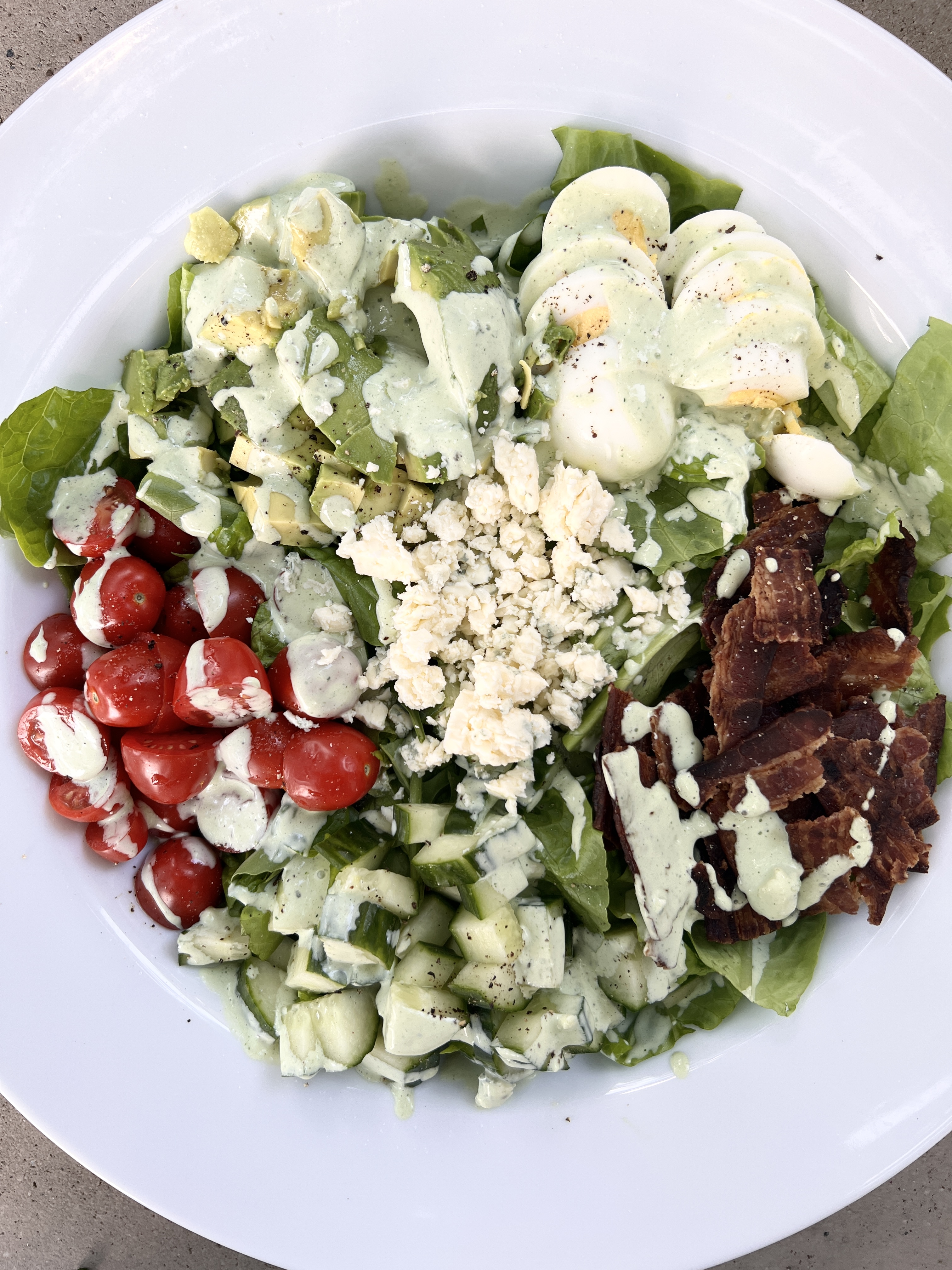 To make the salad, layer fresh greens in the bottom of a large, shallow serving bowl. Add chopped cucumber, tomatoes, sliced hard boiled egg, chopped cooked bacon and chopped avocado around the perimeter of the greens and more blue cheese in the center. Drizzle the entire salad with dressing. Would also be delicious with chicken, shrimp or steak or with the addition of different vegetables!