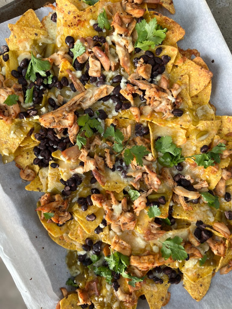 do this: Heat a saucepan or skillet over medium heat and add the broth, salsa and chicken. When it comes to a boil, turn down to a simmer and cook for about 20 minutes – until chicken is cooked through, flipping occasionally. Season with salt and pepper. Pull the chicken out of the sauce and chop it up – then add back into the sauce to cool while you assemble the nachos. Preheat the oven to 400 degrees. Line a jelly roll pan with parchment paper. Lay the chips in a single layer – distribute cheeses, beans, green chiles and chicken over the chips. Bake for 10-15 minutes – until cheese is melted and chips start to brown in the corners. Serve with guac, sour cream, salsa and cilantro either on the side or over the top, depending on what your crew prefers!