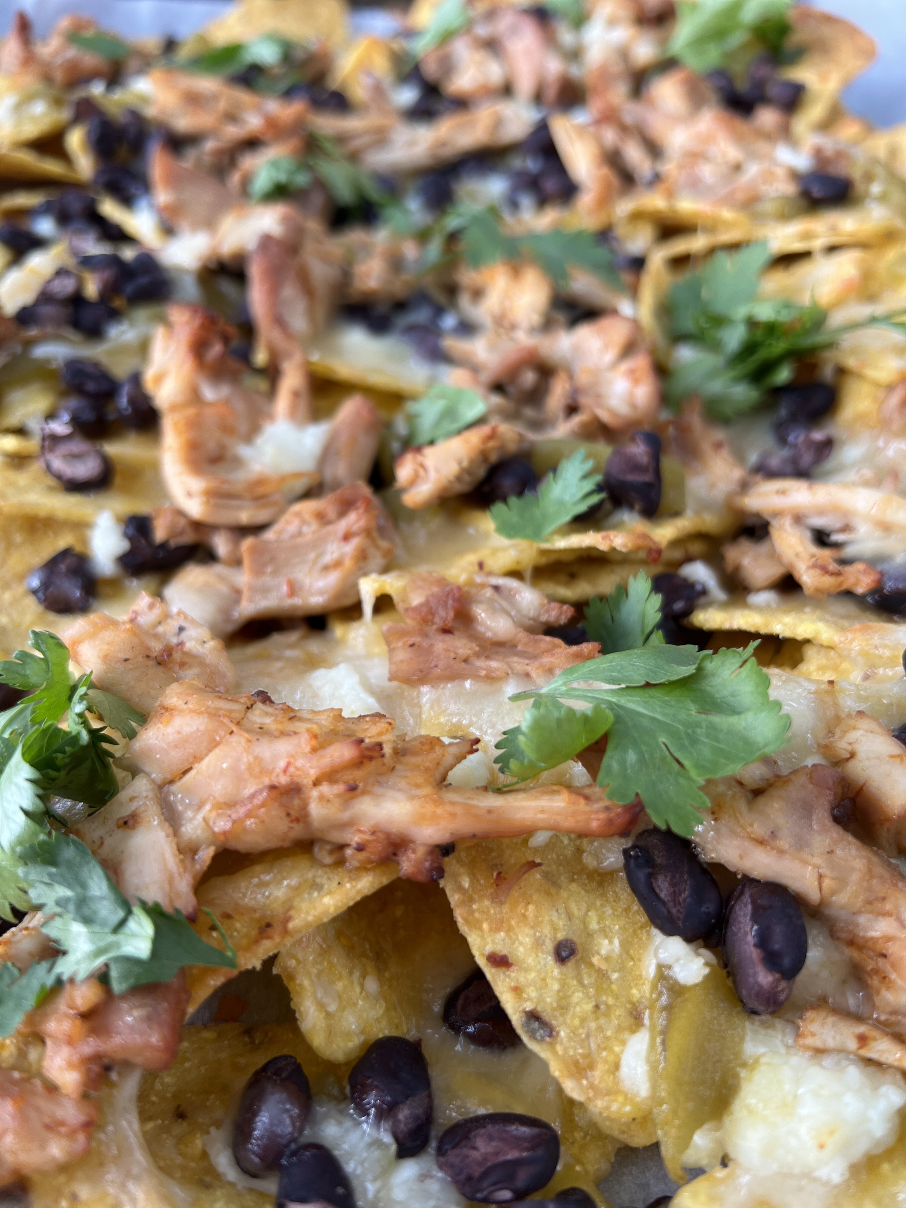 do this: Heat a saucepan or skillet over medium heat and add the broth, salsa and chicken. When it comes to a boil, turn down to a simmer and cook for about 20 minutes – until chicken is cooked through, flipping occasionally. Season with salt and pepper. Pull the chicken out of the sauce and chop it up – then add back into the sauce to cool while you assemble the nachos. Preheat the oven to 400 degrees. Line a jelly roll pan with parchment paper. Lay the chips in a single layer – distribute cheeses, beans, green chiles and chicken over the chips. Bake for 10-15 minutes – until cheese is melted and chips start to brown in the corners. Serve with guac, sour cream, salsa and cilantro either on the side or over the top, depending on what your crew prefers!