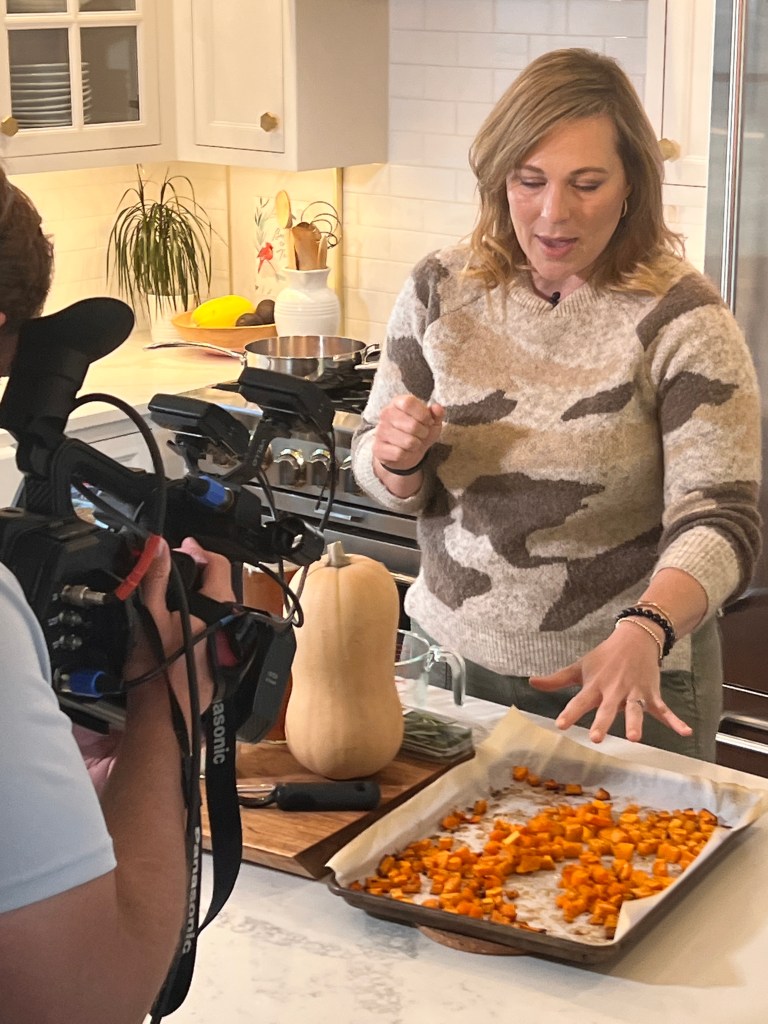 Squash and sage and some sort of salty pork are hallmark flavors for me this time of year and this dish provides all of it in one comforting bite. It’s my take on risotto – swapping out the Arborio rice for nutty, toasty farro. Farro is a whole grain with a terrific texture. It’s great to add to soup, use as the base of a grain salad or just serve as a simple side dish as you would rice or quinoa. I think it creates a more rustic version of risotto that’s a little more filling. I showed the team at Minnesota Live how to make it and when my (always hungry) photographer Bill tried a bite, he asked, “have you made this before?” The question came with good reason – last year at about this time I shared a similar dish – containing sausage and orecchiette pasta instead of the bacon and farro. I hope both meals make it onto your table this fall!