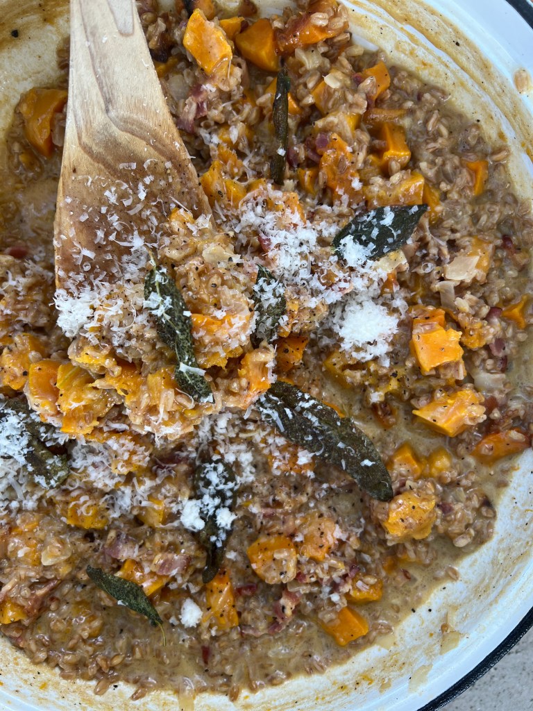 Meanwhile, add the bacon to a large skillet or shallow dutch oven and set to medium heat. Cook until bacon is crisp. Remove bacon from pan and set aside in a small bowl. Leave the fat in the pan and add the onion and garlic. Sauté until onion is translucent – about 3 minutes – and add the uncooked farro. Stir to coat in the fat and toast for about 2 minutes. Then start adding the stock 1 cup at a time. Stir after each addition and add the next cup when the farro has almost absorbed the liquid. Continue adding stock until the farro is tender but not mushy. Add the cream, parmesan, squash and bacon into the pan and stir to combine. Taste and add salt and pepper if needed (remember the bacon and cheese are salty on their own). In a small skillet, melt the butter and add the sage leaves. Fry until crisp and top risotto with them. Add more cheese on top if desired and serve!