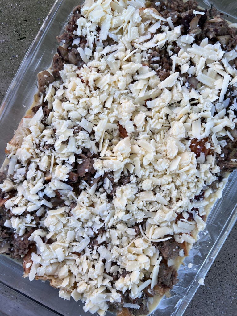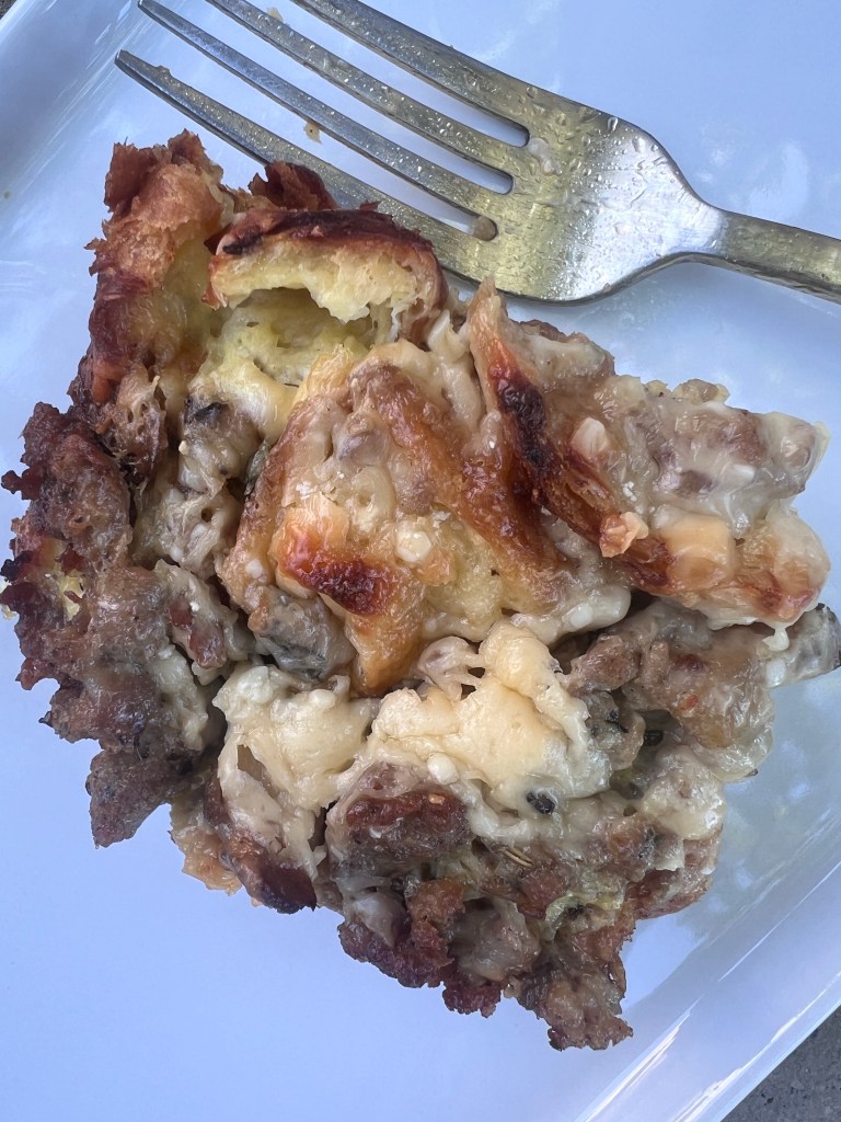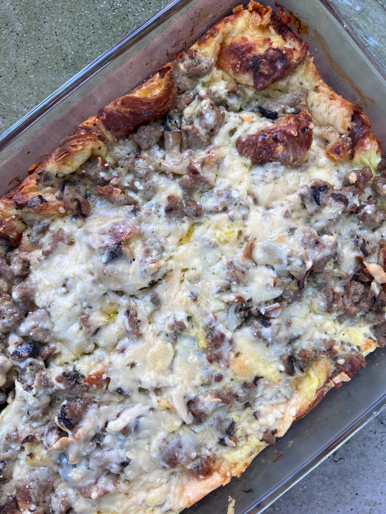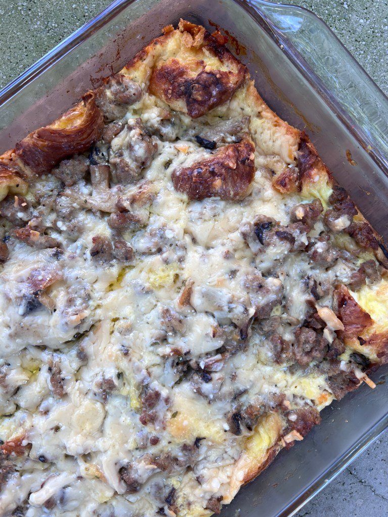 Butter a 9×13 baking dish and place the croissants in an even layer. Add the sausage and mushroom mixture and spread evenly. Pour the milk & egg mixture over the top and sprinkle cheese over the entire pan. Cover tightly and put in the refrigerator overnight. In the morning, take the casserole out the fridge and sit at room temp while you preheat the oven to 375 degrees. Put the foil-covered casserole in the oven and bake for 30 minutes. Remove the foil and bake for an additional 15 minutes until the top is golden and the egg custard is set. Remove from the oven – let stand for about 5 minutes before cutting and serving!