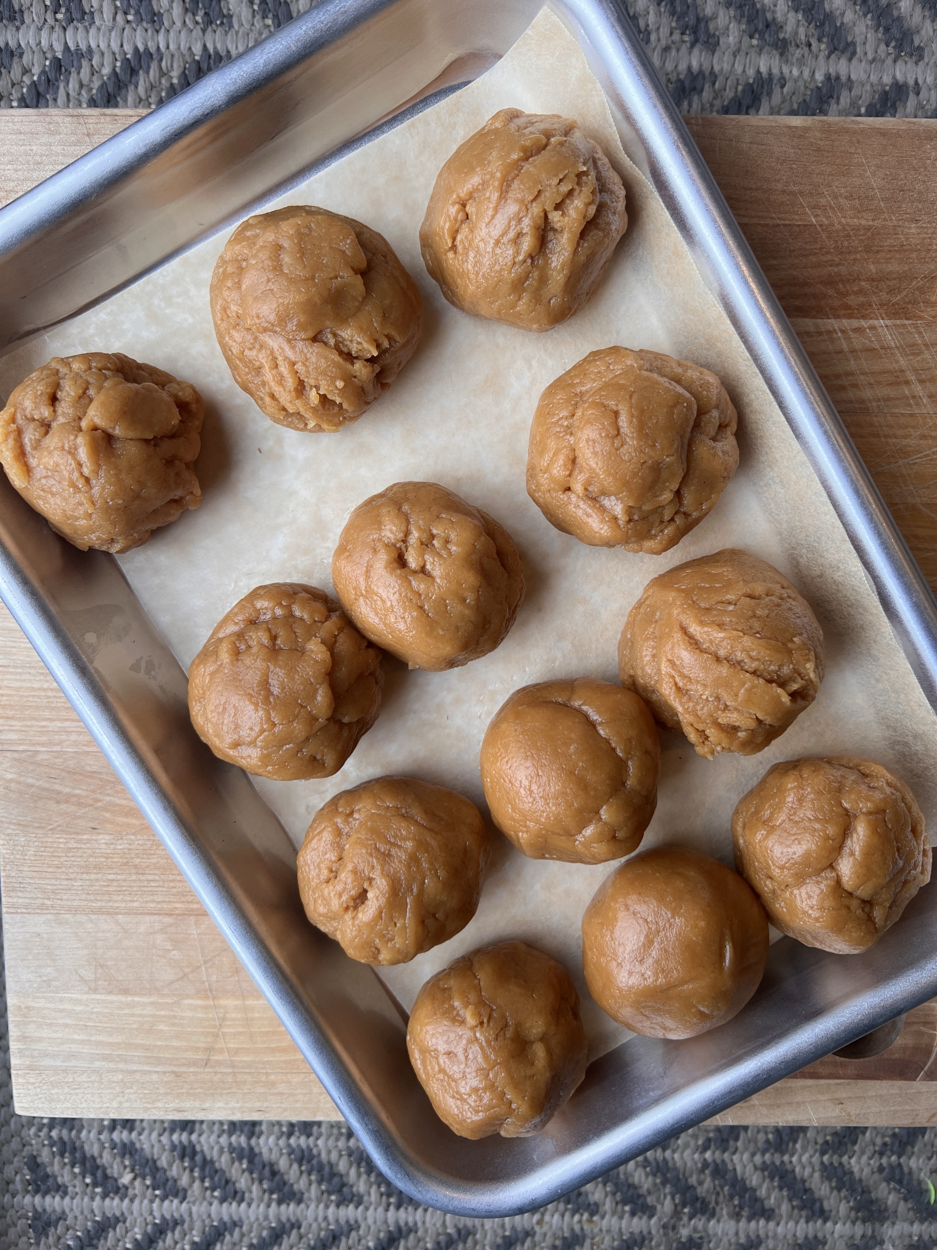 Using a cookie scoop or spoon, make 12 balls. I’ve found it best to press each ball together in my hands and then gently roll so they don’t fall apart.